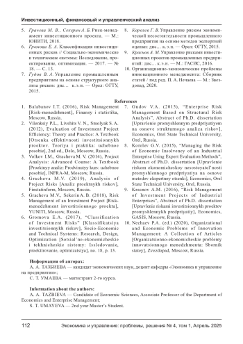 9. Краснов А. М. Управление рисками инвестиционных проектов промышленных предприятий: дис… к. э. н. - М.: ГАСИС, 2016.
