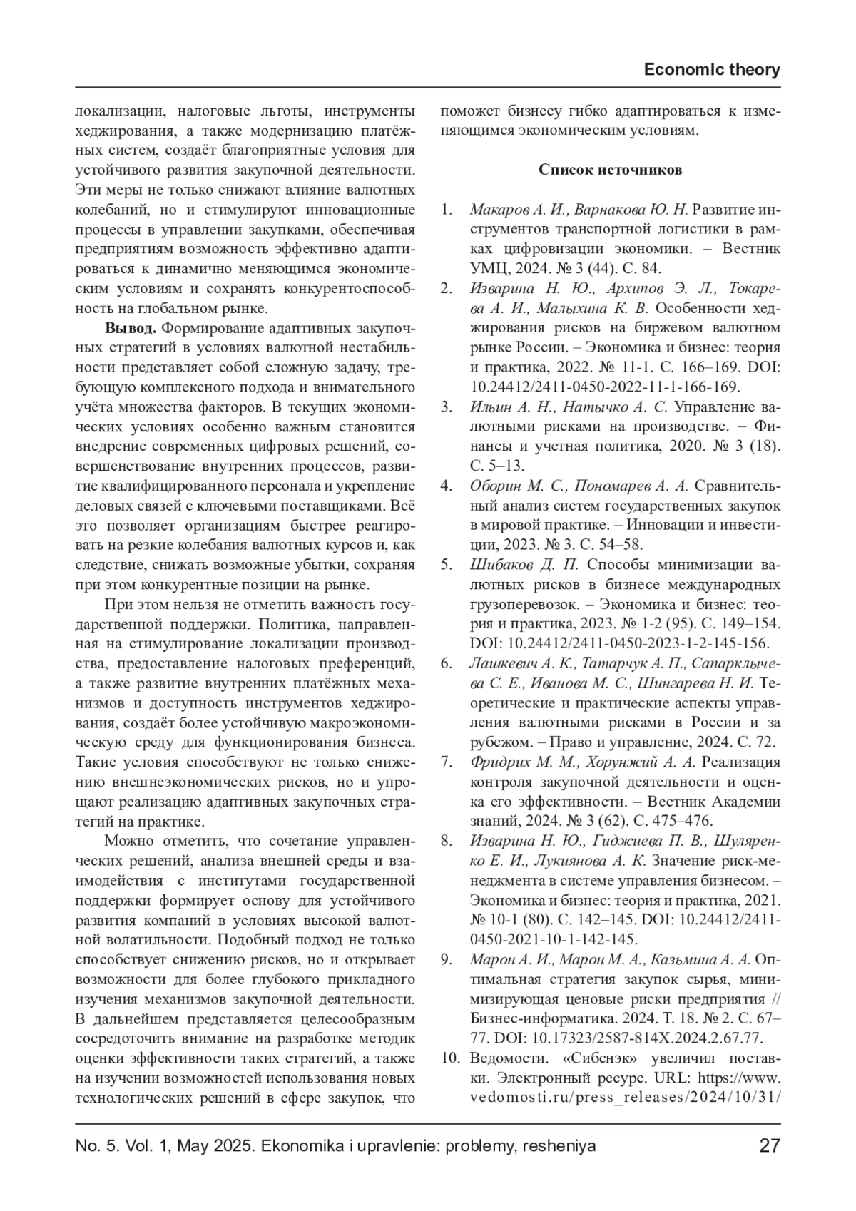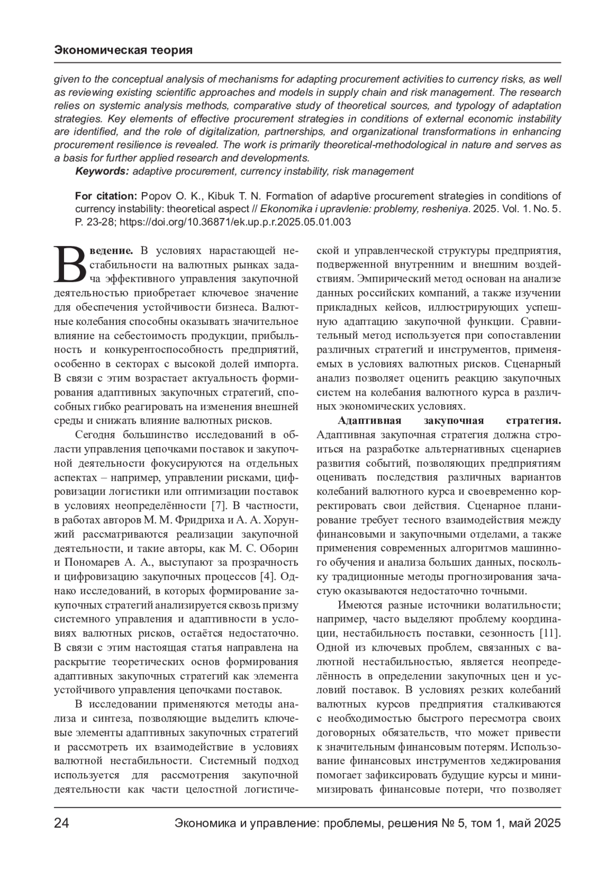 ПОПОВ О. К., КИБУК Т. Н. ФОРМИРОВАНИЕ АДАПТИВНЫХ ЗАКУПОЧНЫХ СТРАТЕГИЙ В УСЛОВИЯХ ВАЛЮТНОЙ НЕСТАБИЛЬНОСТИ: ТЕОРЕТИЧЕСКИЙ АСПЕКТ // ЭКОНОМИКА И УПРАВЛЕНИЕ: ПРОБЛЕМЫ, РЕШЕНИЯ. 2025. ТОМ 1 № 5