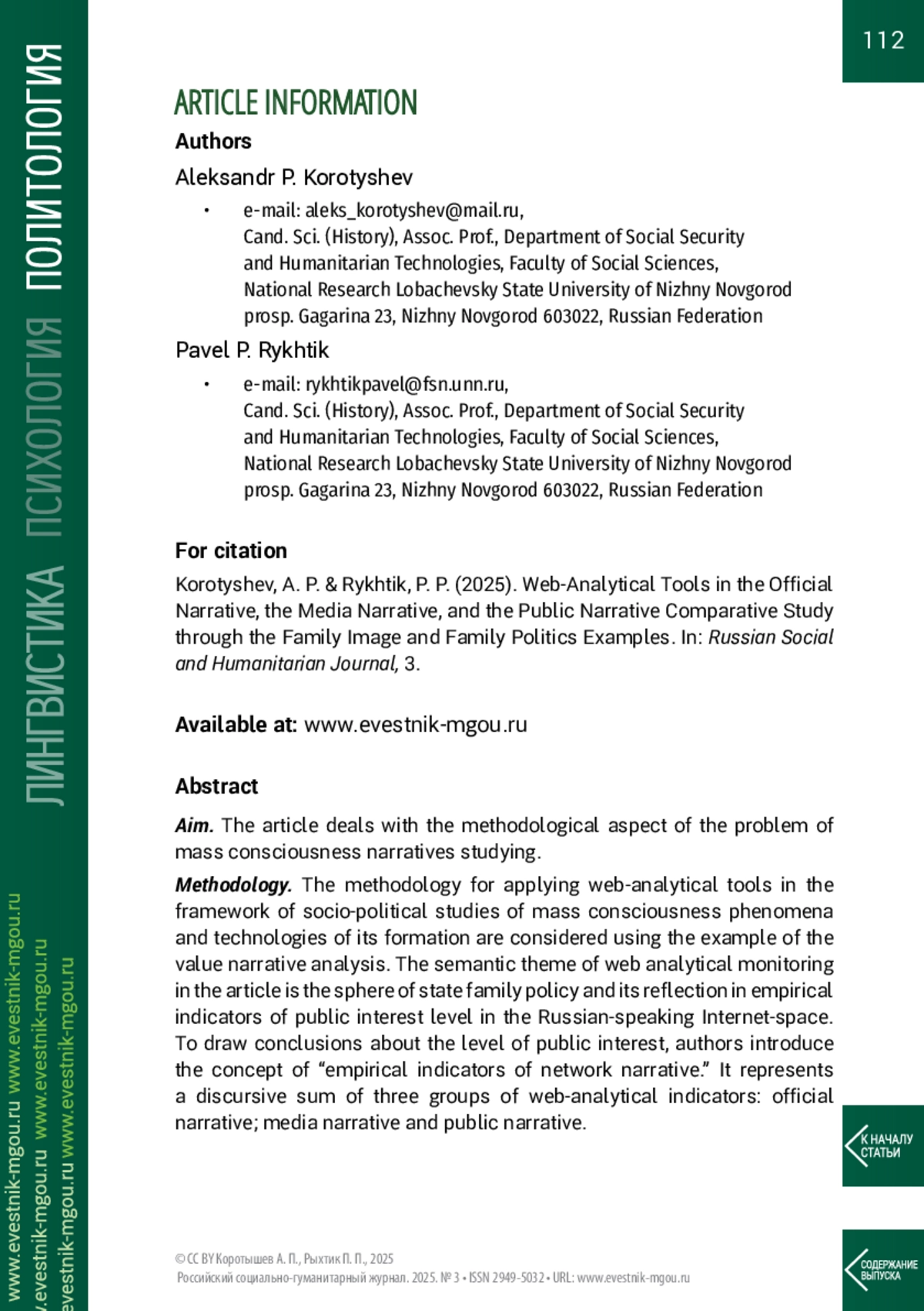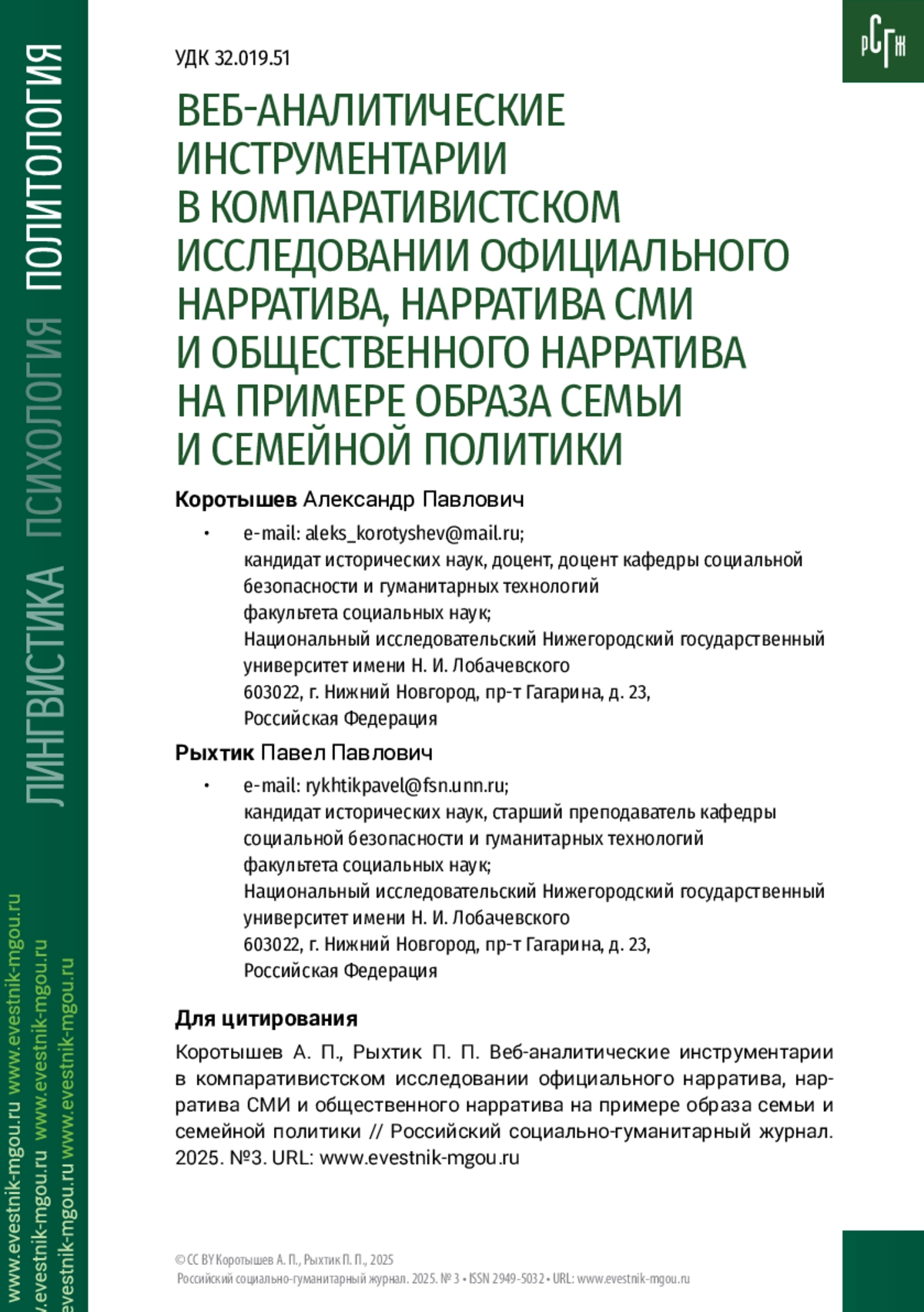Процедура и методы. Методика применения веб-аналитического инструментария в рамках социально-политических исследований феноменов массового сознания и технологий их формирования рассматривается на примере анализа сферы ценностного нарратива. Семантической темой веб-аналитического мониторинга в статье выступает сфера государственной семейной политики и её отражение в эмпирических показателях сетевой активности пользователей в русскоязычном пространстве сети Интернет. Для построения выводов об уровне общественного интереса вводится понятие «эмпирические показатели сетевого нарратива» как дискурсивной суммы трёх групп веб-аналитических показателей: официального нарратива, нарратива СМИ и общественного нарратива.