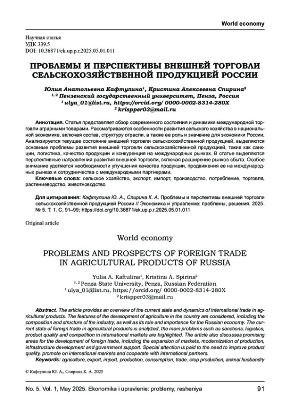 Статья представляет обзор современного состояния и динамики международной торговли аграрными товарами. Рассматриваются особенности развития сельского хозяйства в национальной экономике, включая состав, структуру отрасли, а также ее роль и значение для экономики России. Анализируется текущее состояние внешней торговли сельскохозяйственной продукцией, выделяются основные проблемы развития внешней торговли сельскохозяйственной продукцией, такие как санкции, логистика, качество продукции и конкуренция на международных рынках. В статье выделяются перспективные направления развития внешней торговли, включая расширение рынков сбыта. Особое внимание уделяется необходимости улучшения качества продукции, продвижения ее на международных рынках и сотрудничества с международными партнерами.