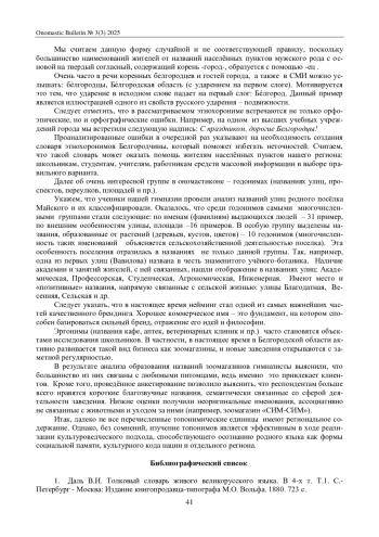 Аннотируемая статья посвящена исследованию структурно-семантических особенностей библионимов писателя-натуралиста Г. А. Скребицкого. Рассматривается специфика названия книг и рассказов Г. А. Скребицкого, определяющая ключевое направление развития его творческой деятельности. Анализируются композиционные приемы и выразительные средства, используемые писателем для обозначения собственных произведений, акцентируя внимание на природных объектах и животных, занимающих важное место в сюжетах его лите-ратуры. Исследование основывается на междисциплинарном подходе, сочетающем методы лингвистического анализа и теории номинации. Подчеркивается роль структуры и значения библионимов как важнейшего компонента в понимании общей концепции природоведческой прозы Г. А. Скребицкого. Описываются пути выражения автором своего отношения к природе посредством особых способов называния своих произведений. Кроме того, рассматривается взаимодействие формы и содержания библионимов, демонстрируя связь между названием и идейно-тематическим содержанием произведений писателя. Исследуется вклад структурно-семантических характеристик библионимов в формирование читательского восприятия и интерпретации художественных образов природы в литературе натуралистического направления. Они заключаются в их простоте, ясности, тематической направленности и способности вызывать интерес у читателя. Отмечается, что писатель использует разнообразные типы названий, чтобы отразить суть произведения, создать яркий образ и привлечь внимание к миру природы и животных. Это легко объяснить, зная цель автора: простота и доступность названий делают его произведения привлекательными для детской аудитории, помогая им познавать окружающий мир.