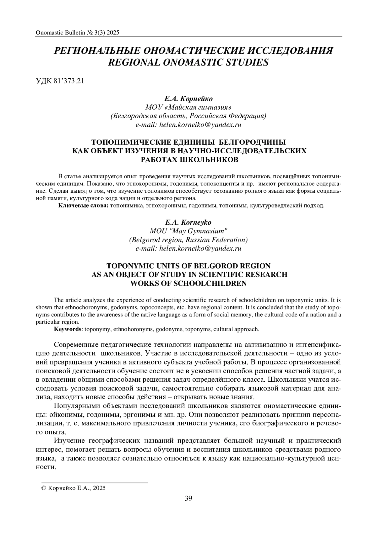 В статье анализируется опыт проведения научных исследований школьников, посвящённых топонимическим единицам. Показано, что этнохоронимы, годонимы, топоконцепты и пр. имеют региональное содержание. Сделан вывод о том, что изучение топонимов способствует осознанию родного языка как формы социальной памяти, культурного кода нации и отдельного региона.