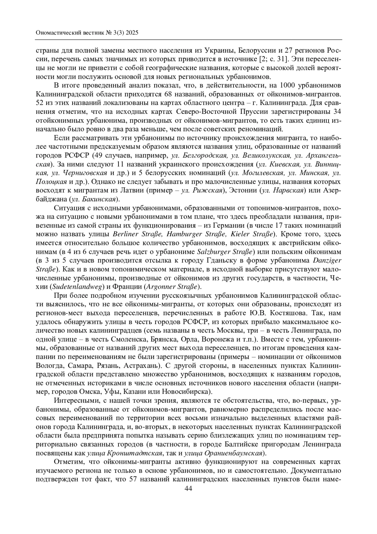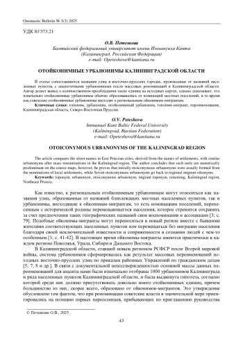 В статье сопоставляются названия улиц в восточно-прусских городах, производные от названий населенных пунктов, с аналогичными урбанонимами после массовых реноминаций в Калининградской области. Автор делает вывод о количественном преобладании таких единиц на исходных картах, однако доказывает, что изначально отойконимные урбанонимы обычно образовывались от номинаций местных поселений, в то время как советские отойконимные урбанонимы восходят к региональным ойконимаммигрантам.