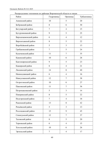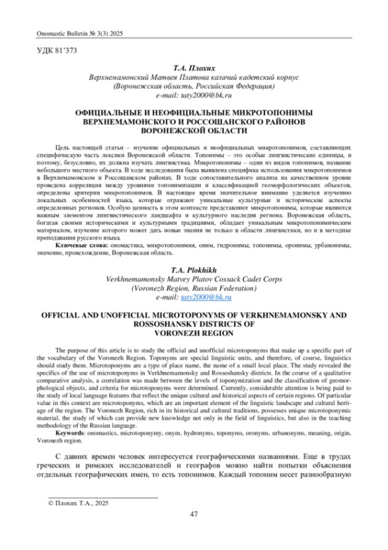 Цель настоящей статьи – изучение официальных и неофициальных микротопонимов, составляющих специфическую часть лексики Воронежской области. Топонимы – это особые лингвистические единицы, и поэтому, безусловно, их должна изучать лингвистика. Микротопонимы – один из видов топонимов, название небольшого местного объекта. В ходе исследования была выявлена специфика использования микротопонимов в Верхнемамонском и Россошанском районах. В ходе сопоставительного анализа на качественном уровне проведена корреляция между уровнями топонимизации и классификацией геоморфологических объектов, определены критерии микротопонимов. В настоящее время значительное внимание уделяется изучению локальных особенностей языка, которые отражают уникальные культурные и исторические аспекты определенных регионов. Особую ценность в этом контексте представляют микротопонимы, которые являются важным элементом лингвистического ландшафта и культурного наследия региона. Воронежская область, богатая своими историческими и культурными традициями, обладает уникальным микротопонимическим материалом, изучение которого может дать новые знания не только в области лингвистики, но и в методике преподавания русского языка.