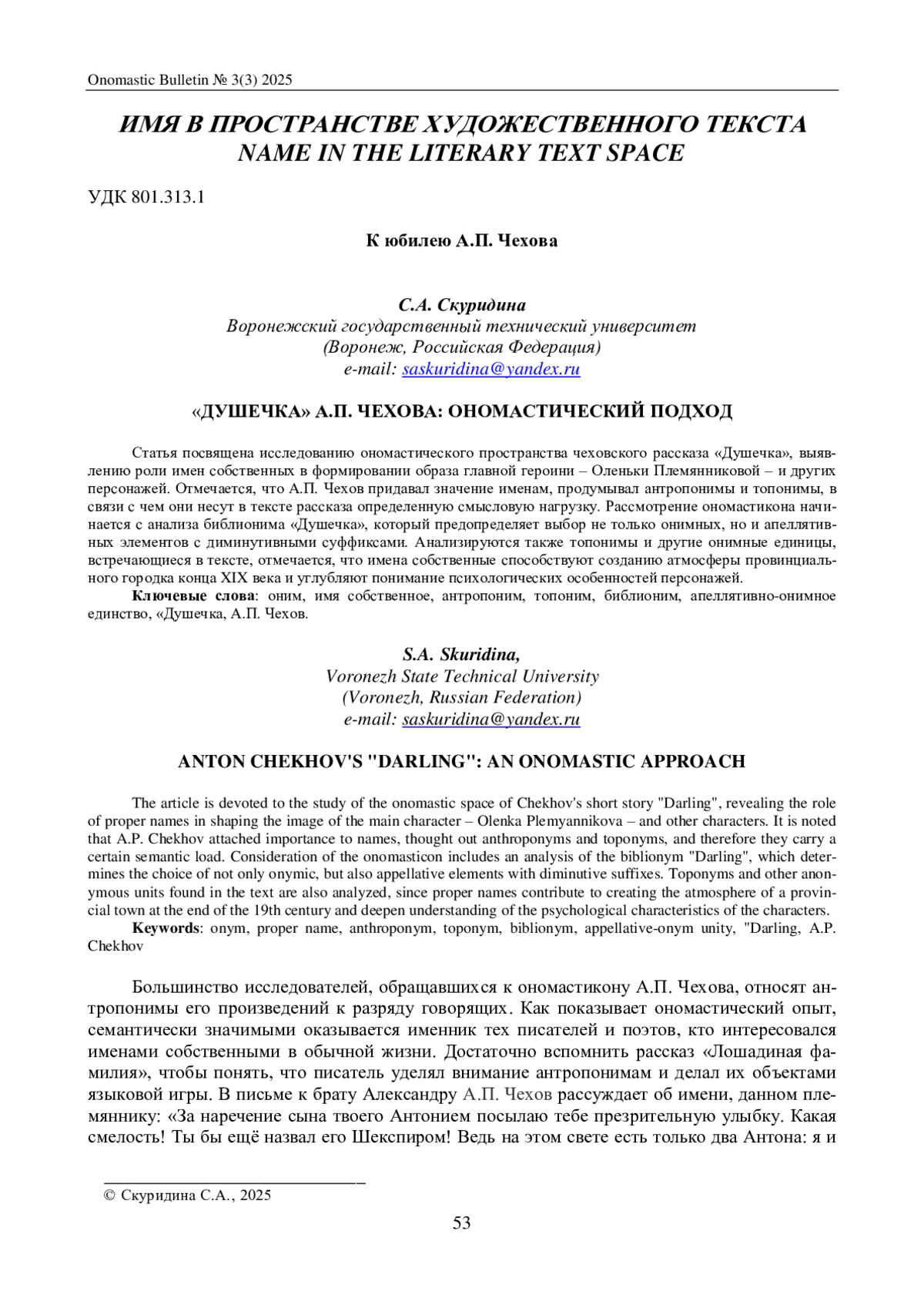 Статья посвящена исследованию ономастического пространства чеховского рассказа «Душечка», выяв-лению роли имен собственных в формировании образа главной героини – Оленьки Племянниковой – и других персонажей. Отмечается, что А. П. Чехов придавал значение именам, продумывал антропонимы и топонимы, в связи с чем они несут в тексте рассказа определенную смысловую нагрузку. Рассмотрение ономастикона начинается с анализа библионима «Душечка», который предопределяет выбор не только онимных, но и апеллятивных элементов с диминутивными суффиксами. Анализируются также топонимы и другие онимные единицы, встречающиеся в тексте, отмечается, что имена собственные способствуют созданию атмосферы провинциального городка конца XIX века и углубляют понимание психологических особенностей персонажей.