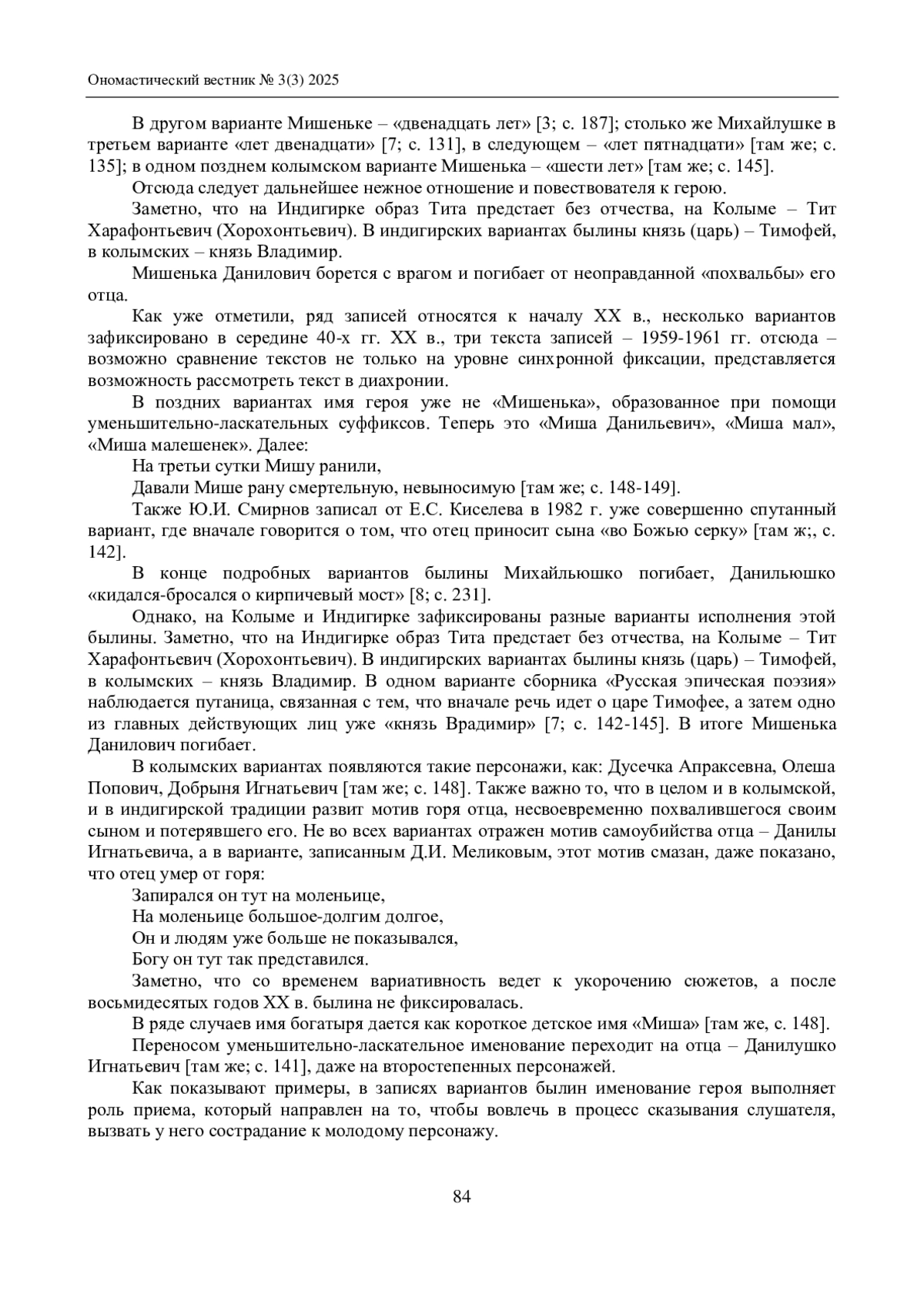 В статье рассматриваются особенности именования былинного образа в двух селах на реках Колыма и Индигирка. Имеются записи вариантов былины с конца XIX в. по 80-е гг. ХХ в. На примере образа богатыря Михайлы Даниловича прослеживается местная специфика, связанная с личным отношением исполнителя к своему герою.