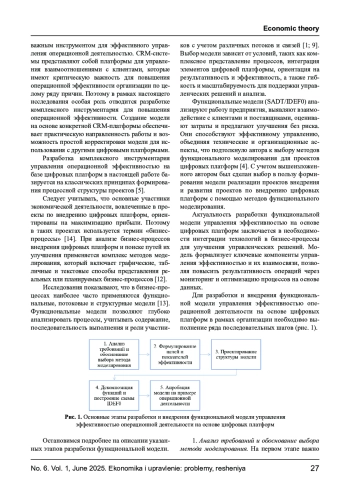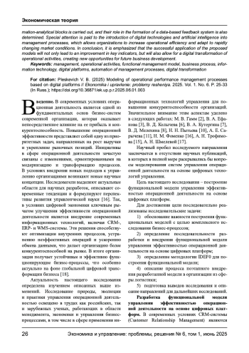 В статье рассматривается моделирование процессов управления эффективностью операционной деятельности с использованием современных цифровых платформ. Описываются ключевые аспекты, необходимые для создания функциональных моделей, нацеленных на оптимизацию управленческих решений. Проведено описание целевого блока, блока задач, функционального и информационно-аналитического блоков, также определена их роль в формировании системы обратной связи, основанной на данных. Особое внимание уделяется внедрению цифровых технологий и искусственного интеллекта в процессы управления, что позволяет организациям повысить операционную эффективность и адаптироваться к быстро меняющимся условиям рынка. В заключение подчеркивается, что успешное применение предложенных моделей не только приведет к улучшению ключевых показателей, но и позволит провести цифровую трансформацию операционной деятельности, создавая новые возможности для будущего развития бизнеса.