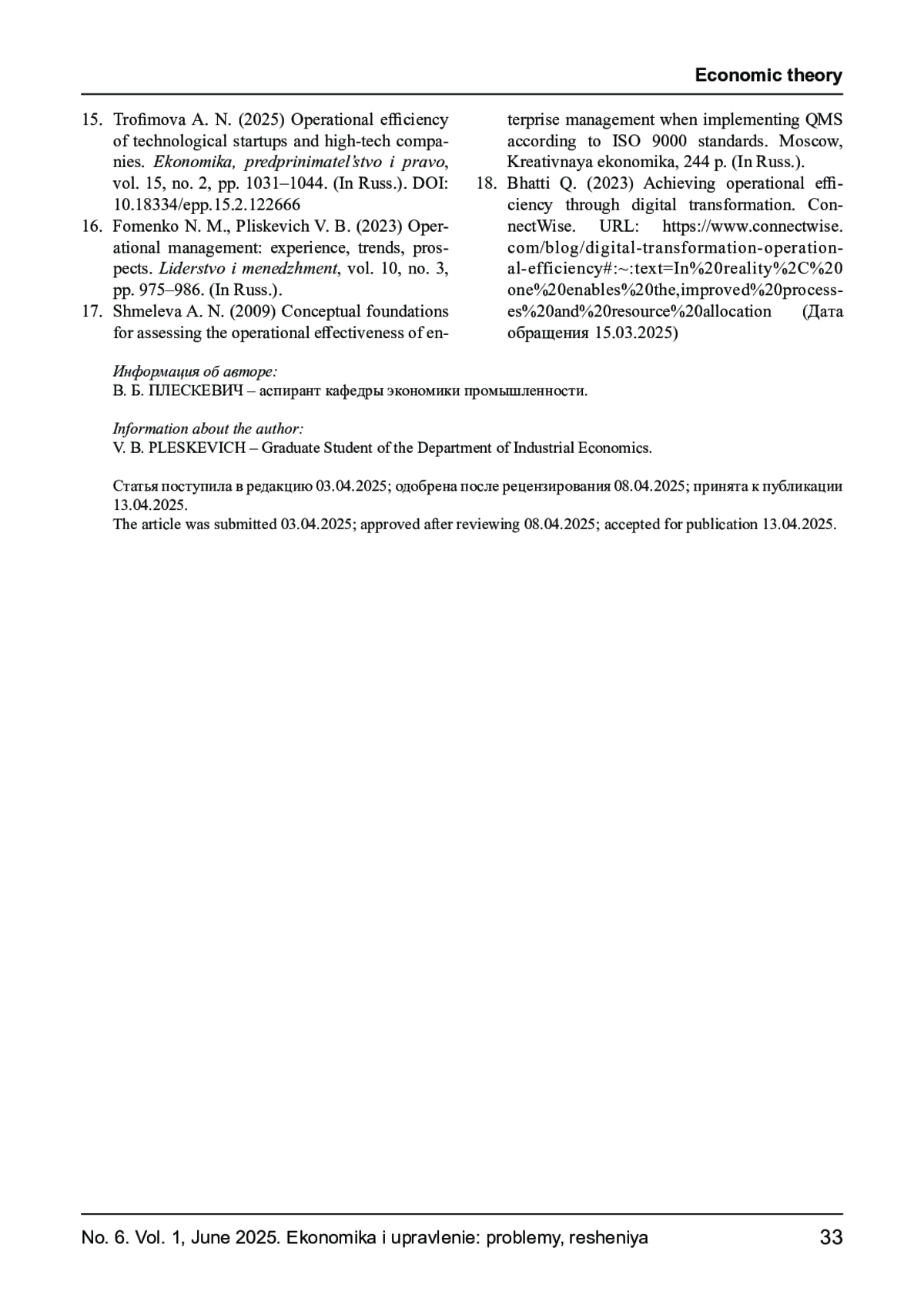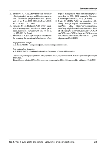 16. Фоменко Н. М., Плескевич В. Б. Управление операционной деятельностью: опыт, тенденции, перспективы // Лидерство и менеджмент. 2023. Т. 10, № 3. С. 975-986. EDN: NYPBKT