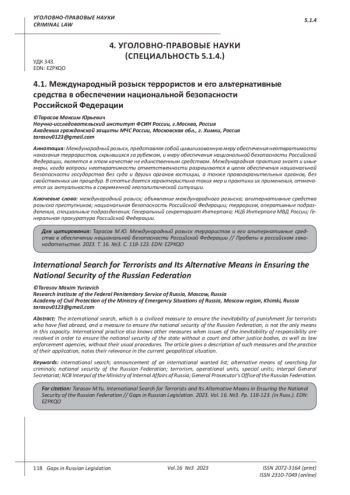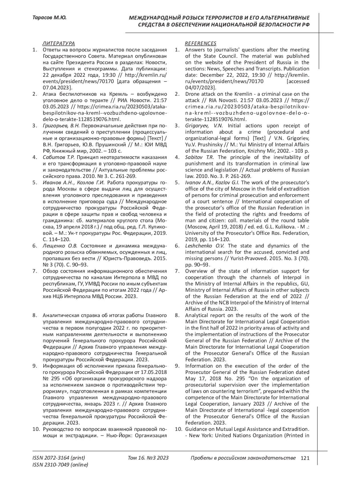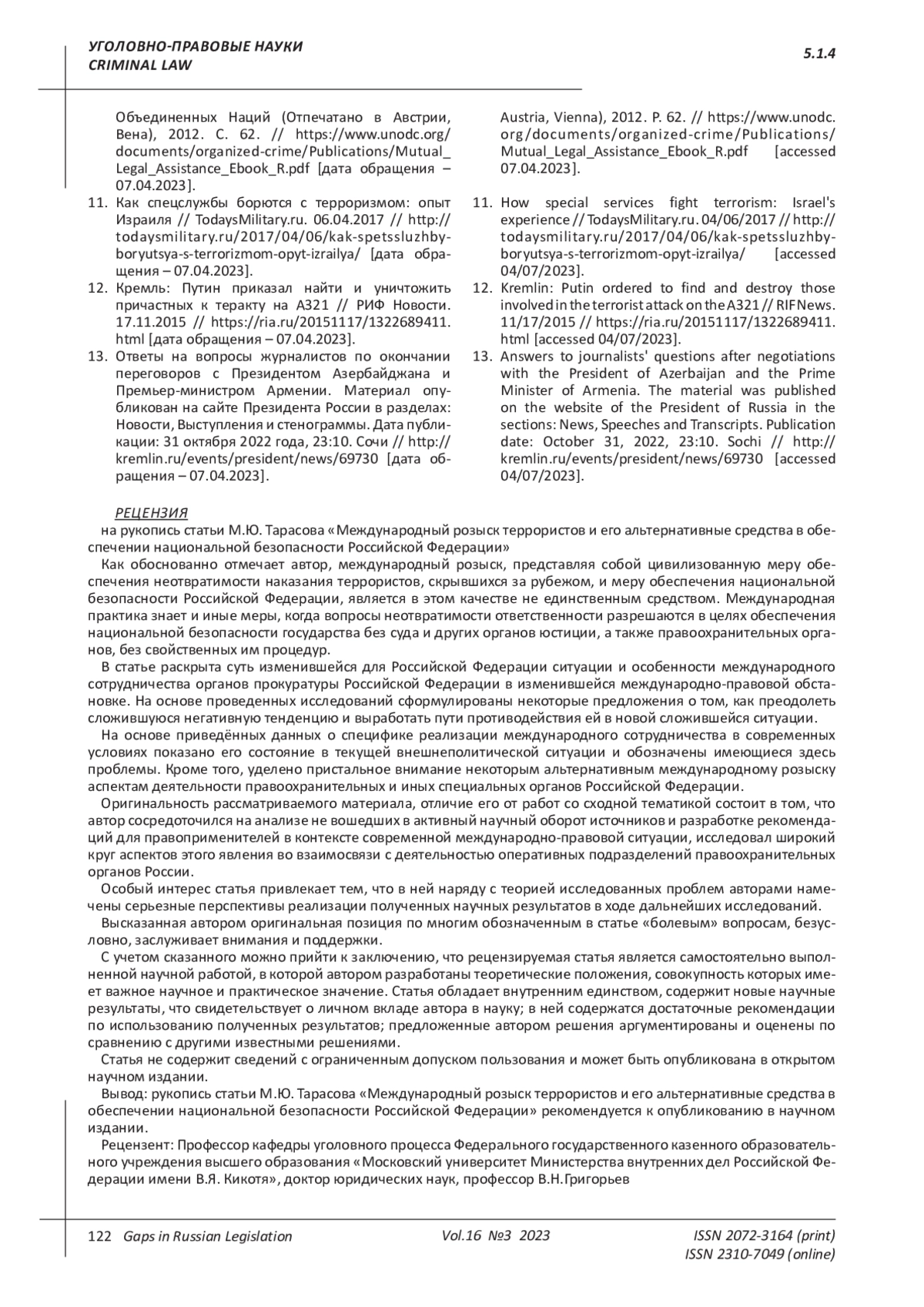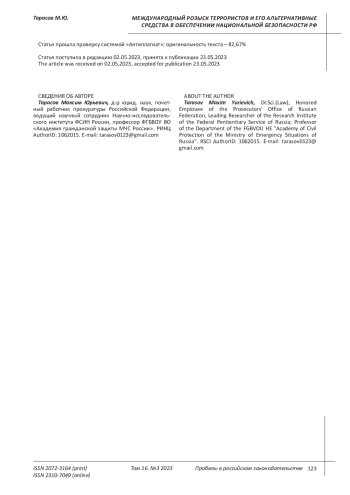 ТАРАСОВ М. Ю. МЕЖДУНАРОДНЫЙ РОЗЫСК ТЕРРОРИСТОВ И ЕГО АЛЬТЕРНАТИВНЫЕ СРЕДСТВА В ОБЕСПЕЧЕНИИ НАЦИОНАЛЬНОЙ БЕЗОПАСНОСТИ РОССИЙСКОЙ ФЕДЕРАЦИИ // ПРОБЕЛЫ В РОССИЙСКОМ ЗАКОНОДАТЕЛЬСТВЕ. 2023. Т. 16 № 3
