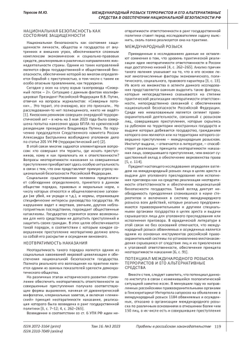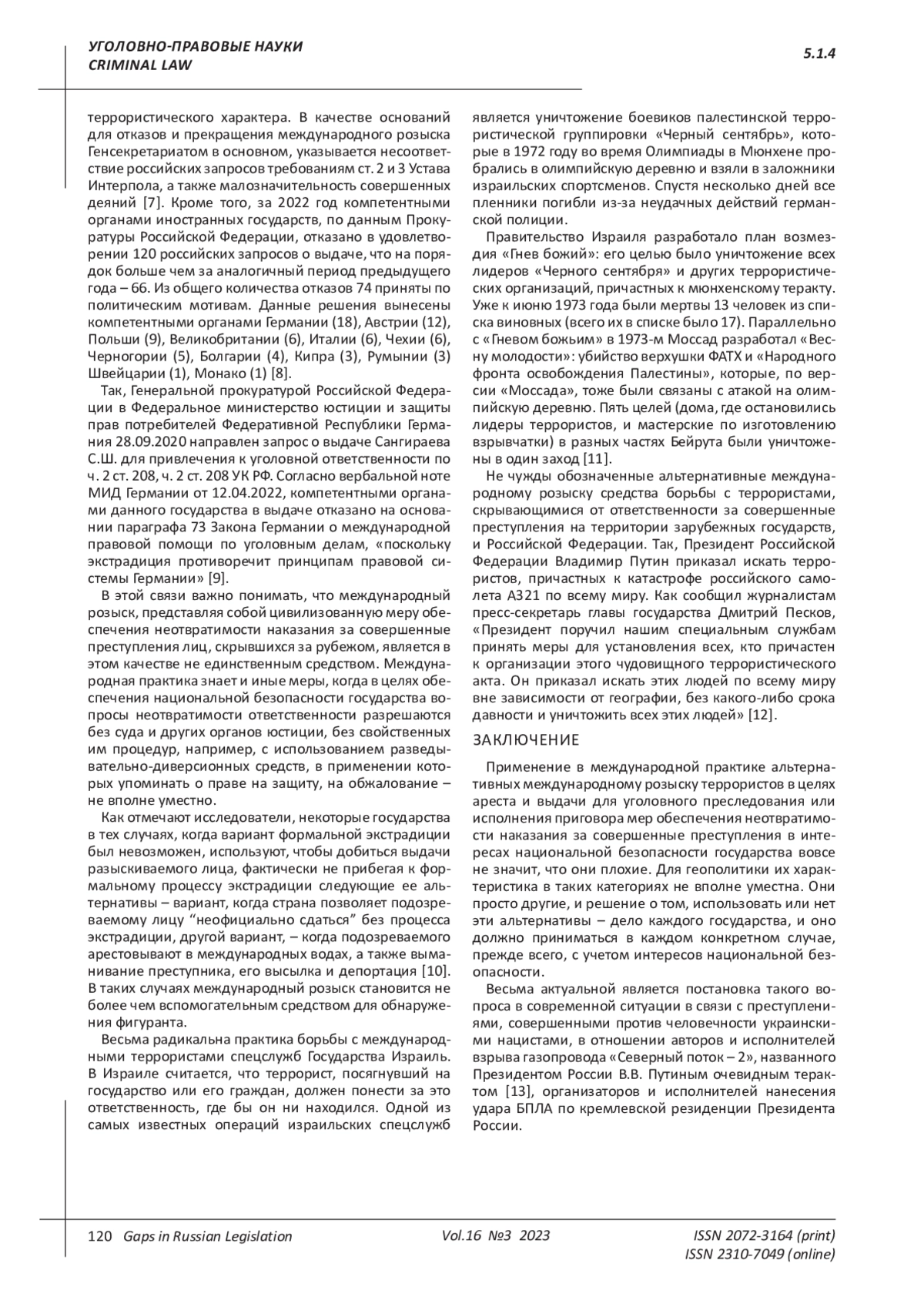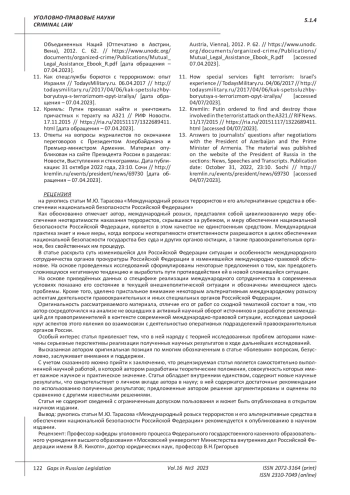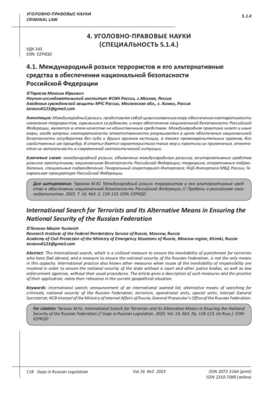 Статья: МЕЖДУНАРОДНЫЙ РОЗЫСК ТЕРРОРИСТОВ И ЕГО АЛЬТЕРНАТИВНЫЕ СРЕДСТВА В ОБЕСПЕЧЕНИИ НАЦИОНАЛЬНОЙ БЕЗОПАСНОСТИ РОССИЙСКОЙ ФЕДЕРАЦИИ (2023)