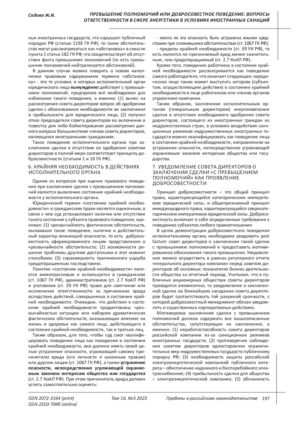 Задача: Причиной написания статьи являются трудности, с которыми столкнулись исполнительные органы российских энергетических компаний, находящихся в период действия иностранных санкционных режимов под контролем иностранных акционеров из недружественных стран. Неработоспособность состоящих из иностранных граждан советов директоров российских энергетических компаний из-за влияния иностранных односторонних мер ограничительного характера (санкций недружественных стран) привела к необходимости обеспечения хозяйственной деятельности таких компаний силами их исполнительного органа и менеджмента. Исполняя обязанность действовать в интересах общества разумно и добросовестно в ситуации бездействия совета директоров, исполнительный орган (генеральный директор) вынужден заключать сделки с формальным превышением полномочий. Цель статьи - выстроить линию защиты действий исполнительного органа как добросовестного поведения и предложить дополнения в действующее законодательство. Модель: Методологическая основа статьи - анализ поведения исполнительного органа юридического лица с точки зрения соблюдения требований принципов добросовестности, баланса публичных и частных интересов, а также на предмет защиты публичного интереса, выполнения установленной законом обязанности действовать в интересах общества, наличия крайней необходимости в действиях, а также установления полномочий, явствующих из обстановки. Областью исследования является добросовестность поведения исполнительного органа российского юридического лица, и способы ее доказывания с целью избежания ответственности исполнительного органа за заключение сделки с формальным превышением полномочий. Выводы: Превышение полномочий при заключении сделки без ее одобрения советом директоров отсутствует, если исполнительны орган докажет, что: (1) был найден баланс публичных и частных интересов; (2) не было иного способа для разрешения коллизии норм двух правопорядков или (3) публичный интерес [обеспечение надежного и бесперебойного энергоснабжения] обладает юридическим приоритетом для целей правовой защиты. Требуется уточнить норму пункта 2 статьи 53.1 ГК РФ, дополнить норму пункта 1 статьи 183 ГК РФ и наполнить новым правовым содержанием понятие «обстановка» в смысле пункта 1 статьи 182 ГК РФ. Рамки исследования/возможность последующего использования результатов научной работы: Результаты исследования являются частью нового комплексного подхода к изучению «недобросовестного поведения» как самостоятельного правового понятия, а также к обоснованию нового метода правового регулирования - отрицания недобросовестного поведения. Практическое значение: Автором предложена система доказывания добросовестности поведения исполнительного органа (генерального директора) на основе действующего законодательства. Для целей избежания ответственности за заключение сделки при отсутствии ее одобрения советом директоров генеральный директор российской компании должен смочь доказать следующее: деятельность общества связана с удовлетворением публичного интереса; прибыльность или выгодность сделки для общества; полномочия по подписанию сделки, явствовали из обстановки; наличие крайней необходимости в действиях исполнительного органа; факт уведомления совет