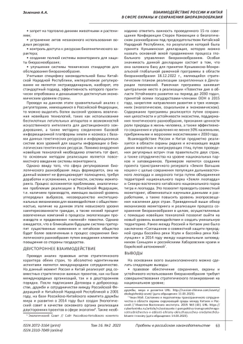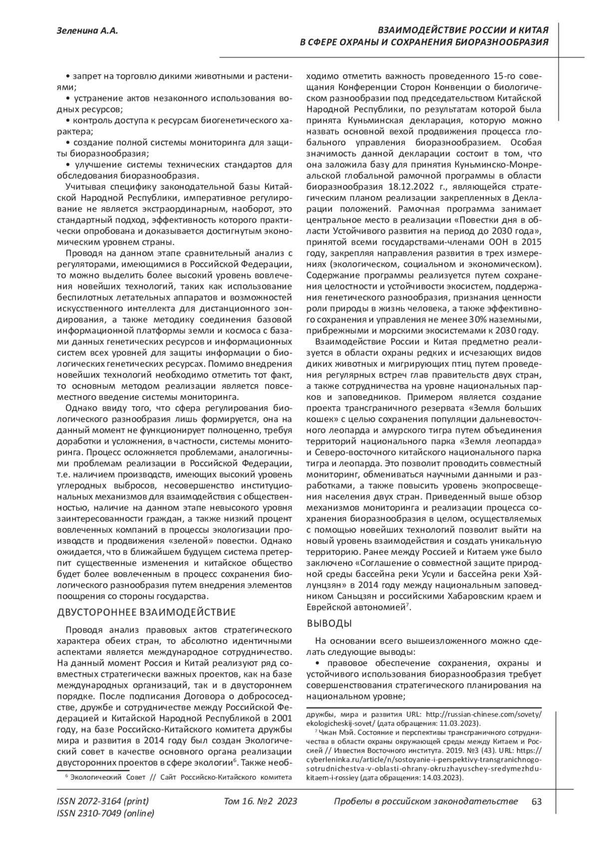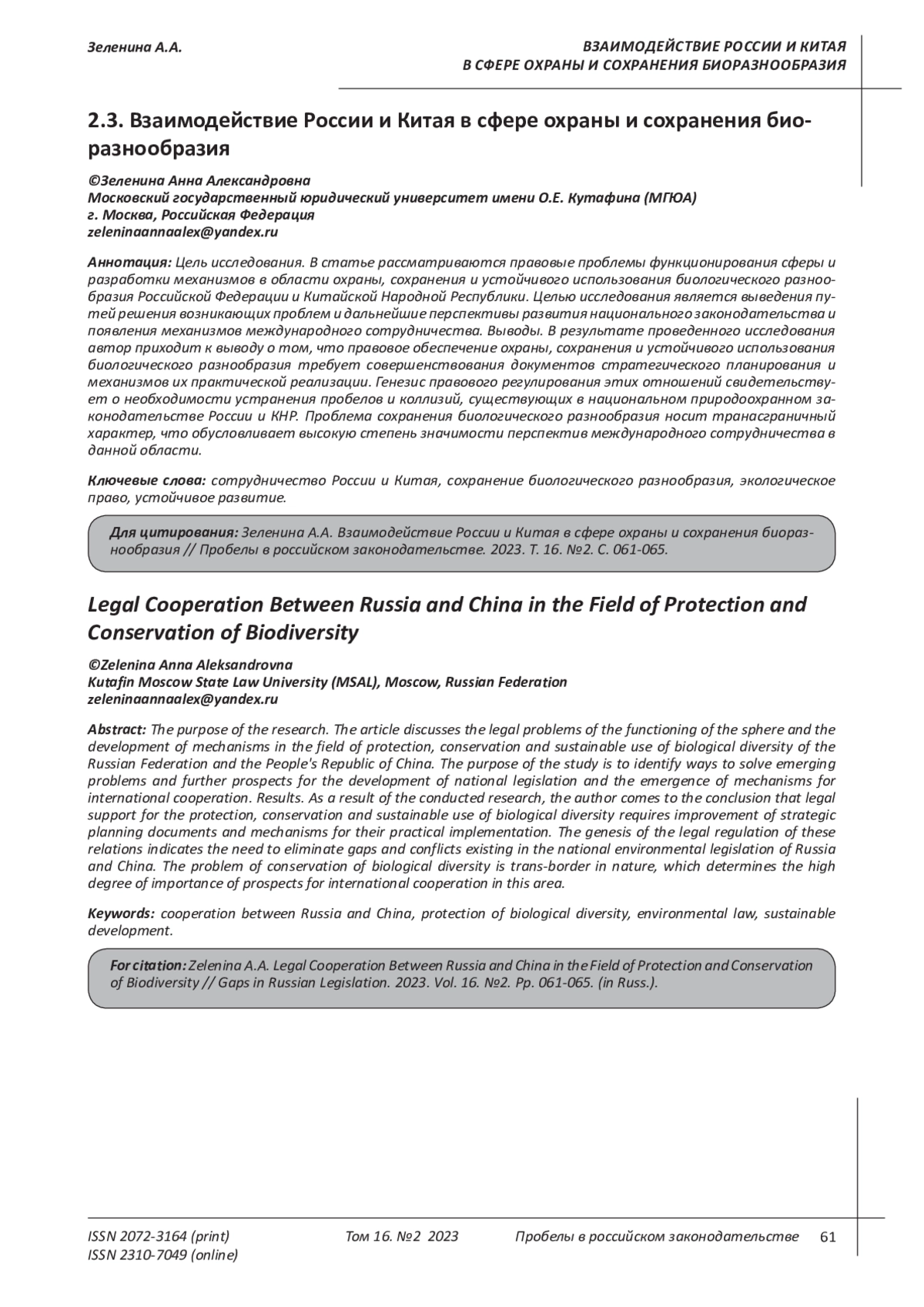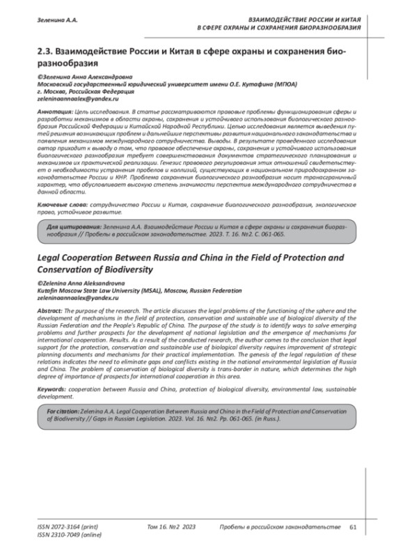 ЗЕЛЕНИНА А. А. ВЗАИМОДЕЙСТВИЕ РОССИИ И КИТАЯ В СФЕРЕ ОХРАНЫ И СОХРАНЕНИЯ БИОРАЗНООБРАЗИЯ // ПРОБЕЛЫ В РОССИЙСКОМ ЗАКОНОДАТЕЛЬСТВЕ. 2023. Т. 16 № 2