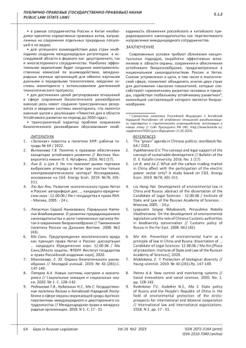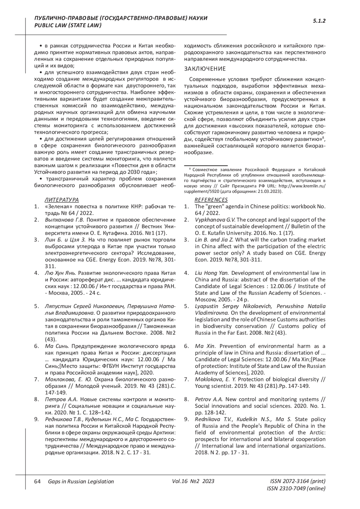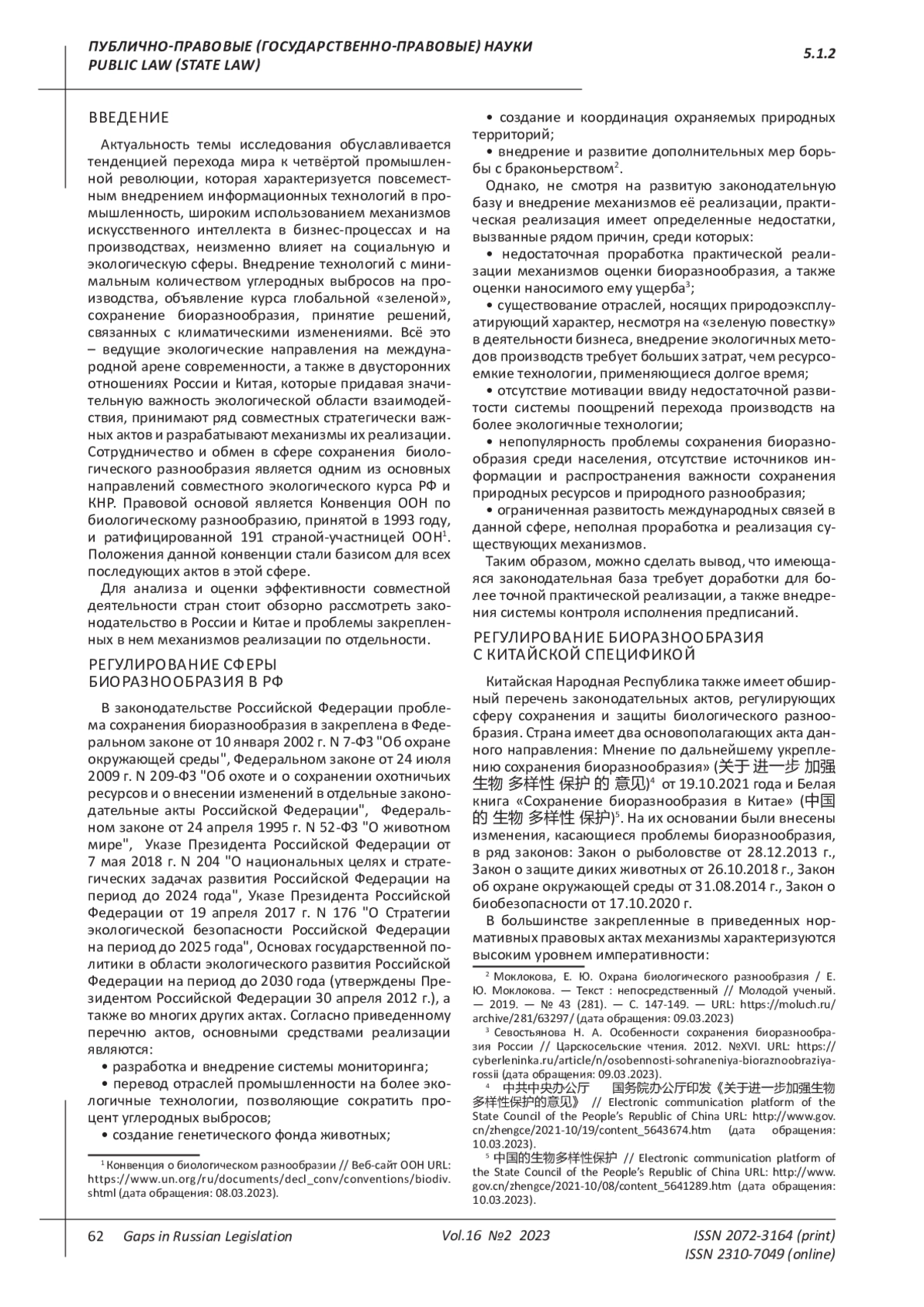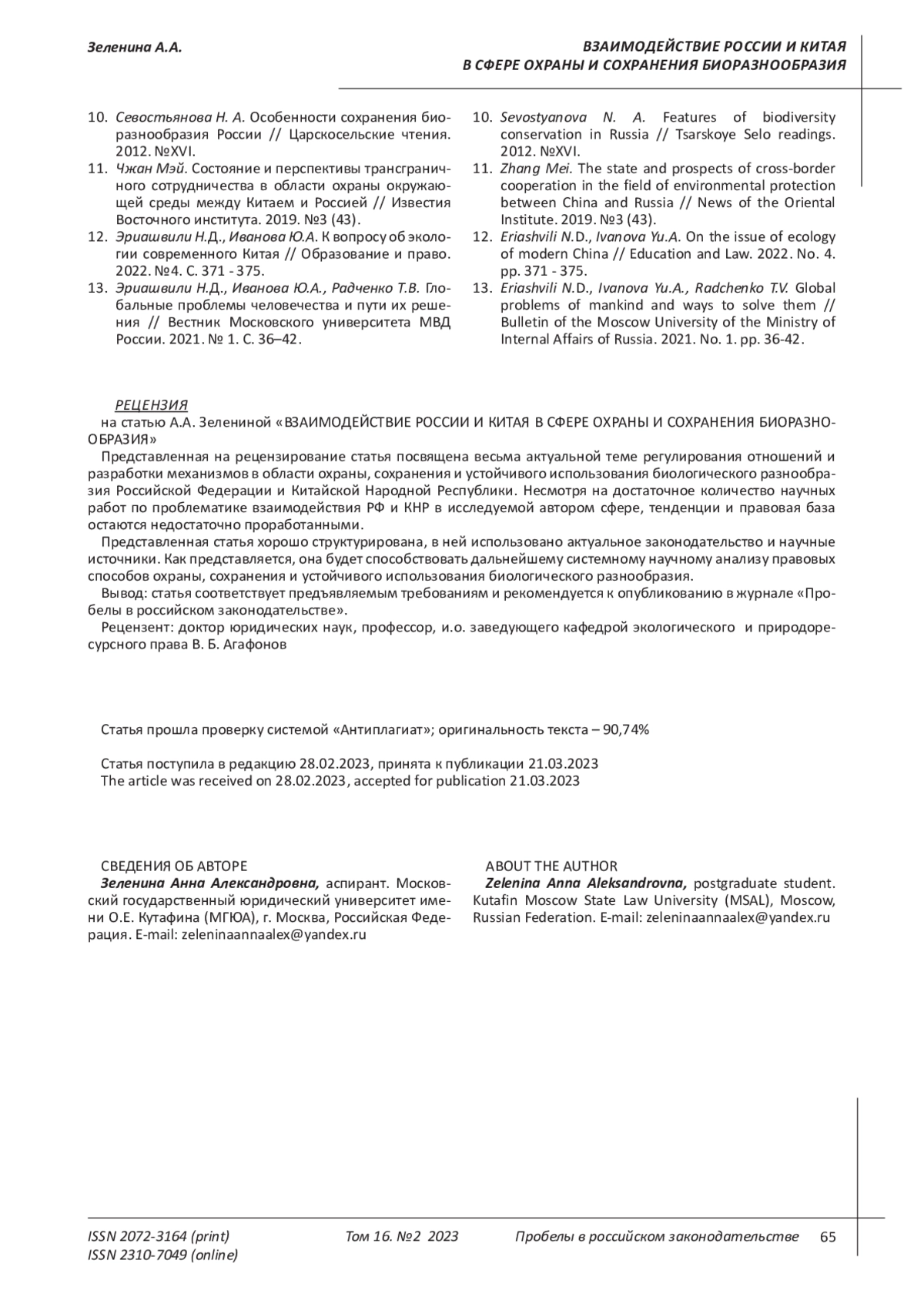 ЗЕЛЕНИНА А. А. ВЗАИМОДЕЙСТВИЕ РОССИИ И КИТАЯ В СФЕРЕ ОХРАНЫ И СОХРАНЕНИЯ БИОРАЗНООБРАЗИЯ // ПРОБЕЛЫ В РОССИЙСКОМ ЗАКОНОДАТЕЛЬСТВЕ. 2023. Т. 16 № 2