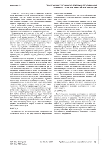 Цель исследования. В статье рассматриваются проблемы конституционно-правового регулирования права собственности в России. Анализируется действующее законодательство, регламентирующее правовой статус различных форм собственности. Целью исследования является выявление основных тенденций и особенностей регулирования данного права в отечественном законодательстве и наиболее значимых положений, определяющих положение собственности в правовой системе, роль права собственности и различия между его субъектами. Выводы. В результате проведенного исследования автор приходит к выводу, что закрепленная Конституцией РФ равная защита всех форм собственности в юридическом смысле не может быть реализована ввиду расширения перечня объектов государственной и муниципальной собственности в сравнении с частной, а также отличий в способах приобретения прав собственности в зависимости от субъекта. Выявляются различия в правовом статусе публичного и частного собственника. Раскрывается возможность ограничения права частной собственности в случаях, предусмотренных законодательством. Выделяется интеллектуальная собственность в качестве отдельной категории, не входящей в систему имущественных прав вследствие особенностей в форме ее существования и правомочиях субъектов.