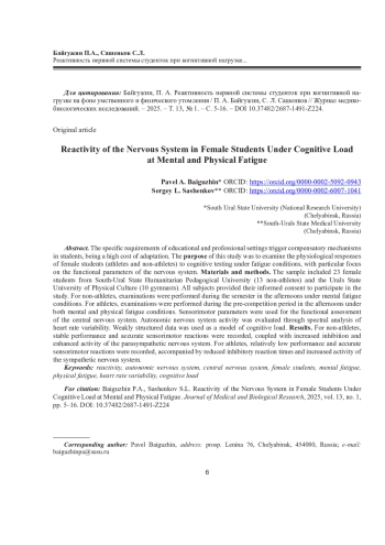 Статья: РЕАКТИВНОСТЬ НЕРВНОЙ СИСТЕМЫ СТУДЕНТОК ПРИ КОГНИТИВНОЙ НАГРУЗКЕ НА ФОНЕ УМСТВЕННОГО И ФИЗИЧЕСКОГО УТОМЛЕНИЯ (2025)