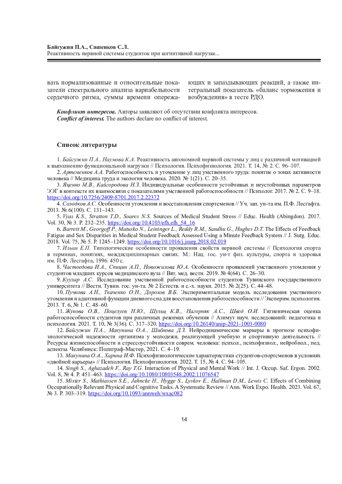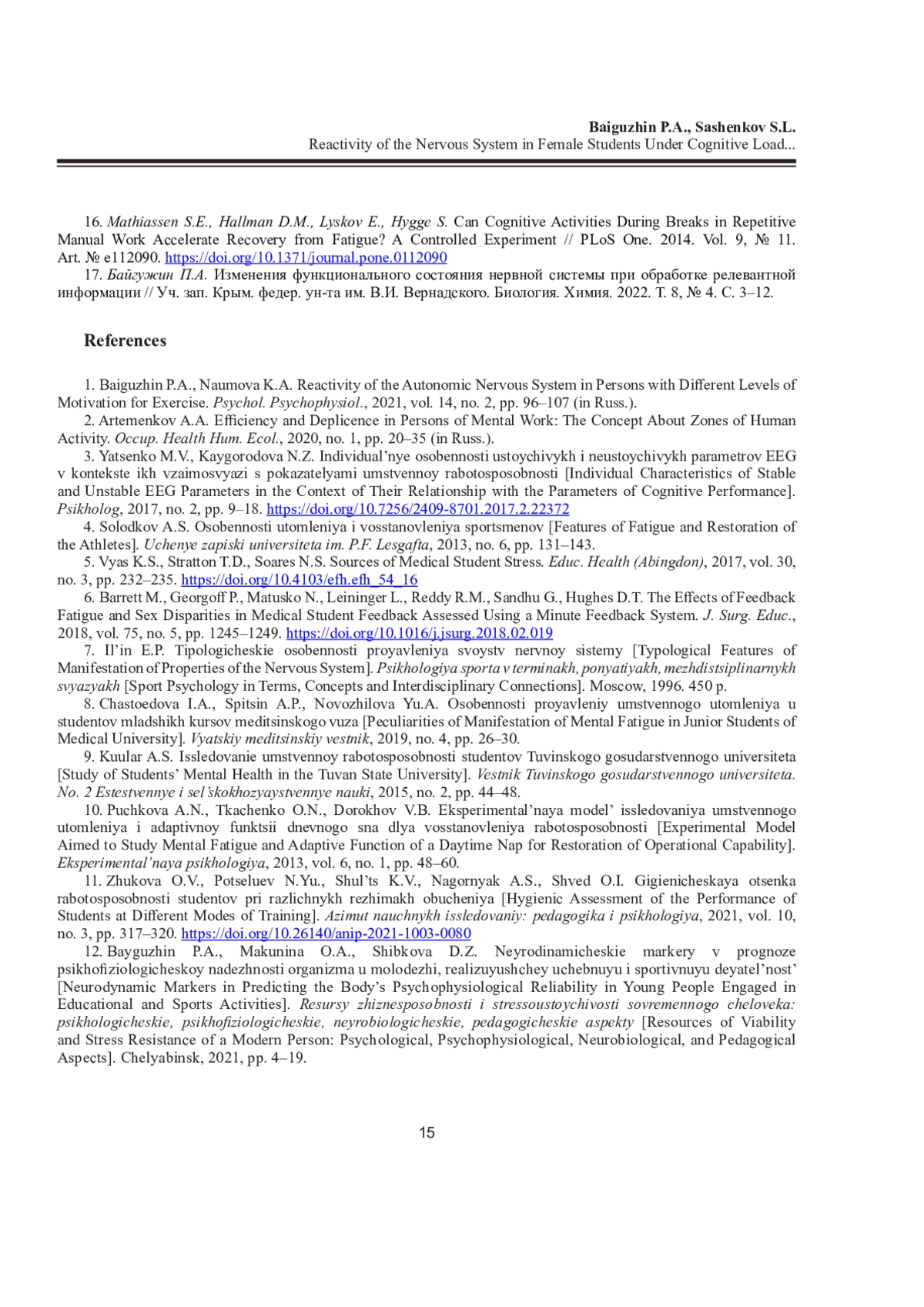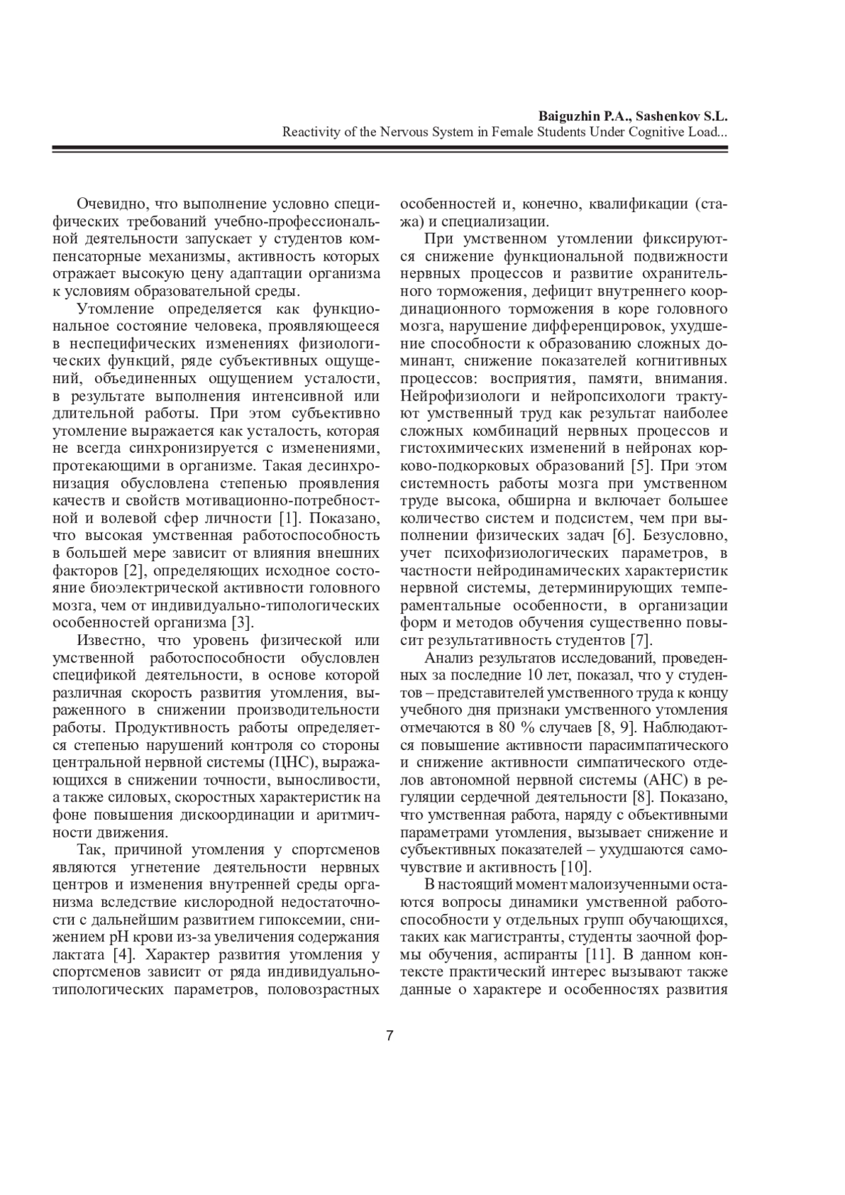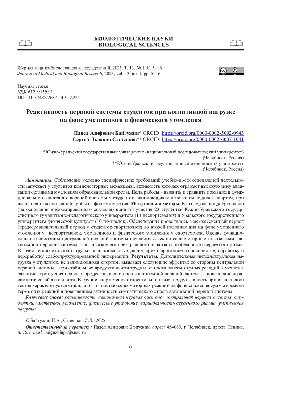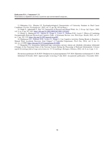БАЙГУЖИН П. А., САШЕНКОВ С. Л. РЕАКТИВНОСТЬ НЕРВНОЙ СИСТЕМЫ СТУДЕНТОК ПРИ КОГНИТИВНОЙ НАГРУЗКЕ НА ФОНЕ УМСТВЕННОГО И ФИЗИЧЕСКОГО УТОМЛЕНИЯ // ЖУРНАЛ МЕДИКО-БИОЛОГИЧЕСКИХ ИССЛЕДОВАНИЙ. 2025. Т. 13 № 1