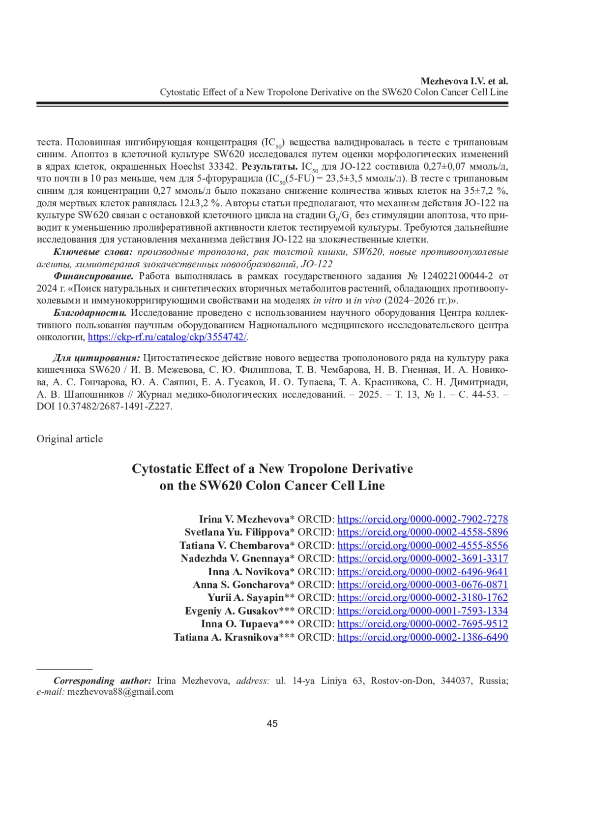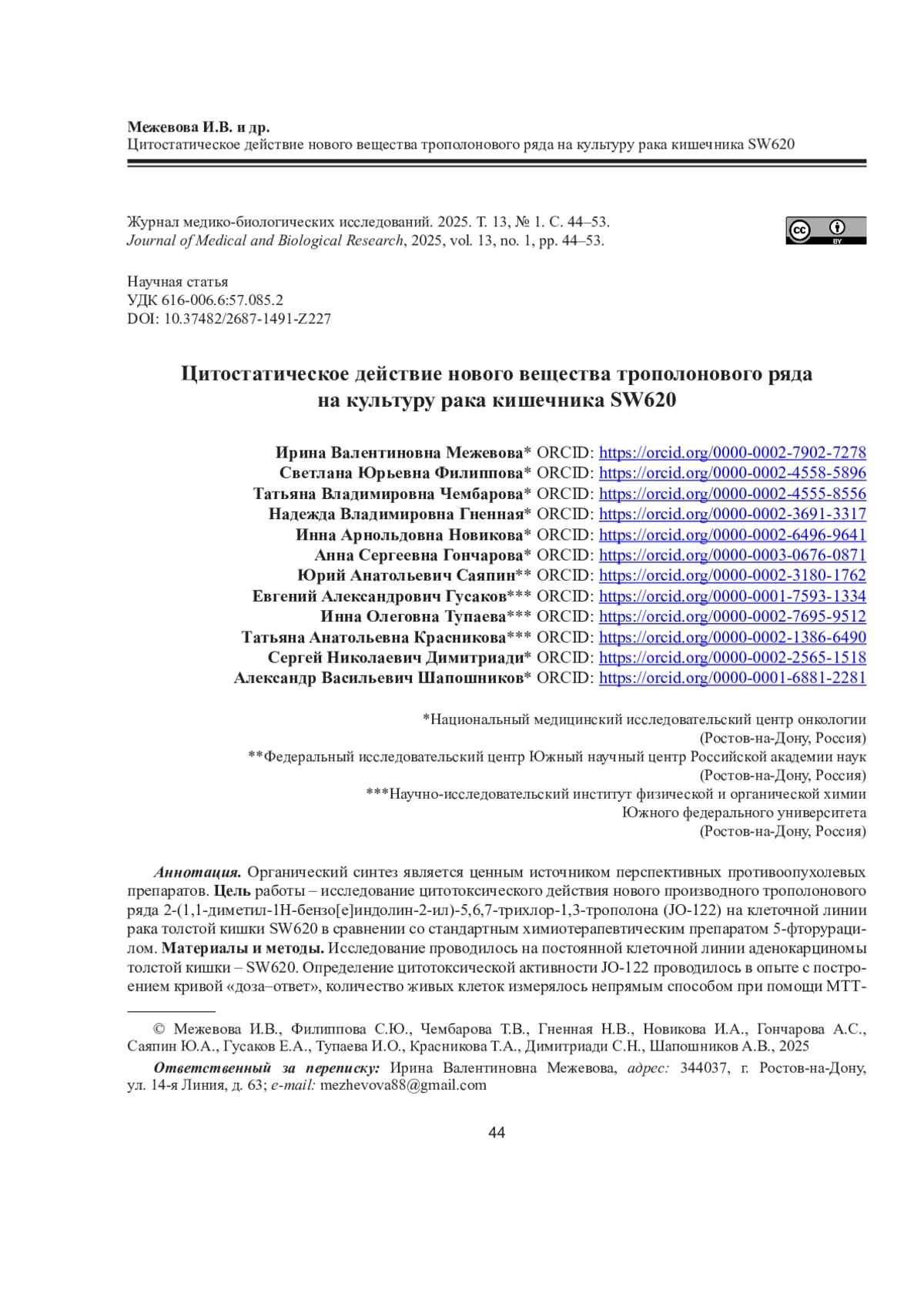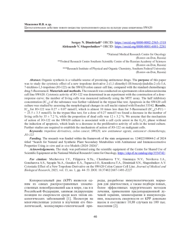 4. Кит О.И., Минкин В.И., Лукбанова Е.А., Саяпин Ю.А., Гусаков Е.А., Ситковская А.О., Филиппова С.Ю., Комарова Е.Ф., Волкова А.В., Ходакова Д.В., Миндарь М.В., Лазутин Ю.Н., Енгибарян М.А., Колесников В.Е. Оценка цитотоксической активности и токсичности производного трополонов с потенциальным противоопухолевым действием // Бюл. сиб. медицины. 2022. Т. 21, No 2. С. 60-66. DOI: 10.20538/1682-0363-2022-2-60-66