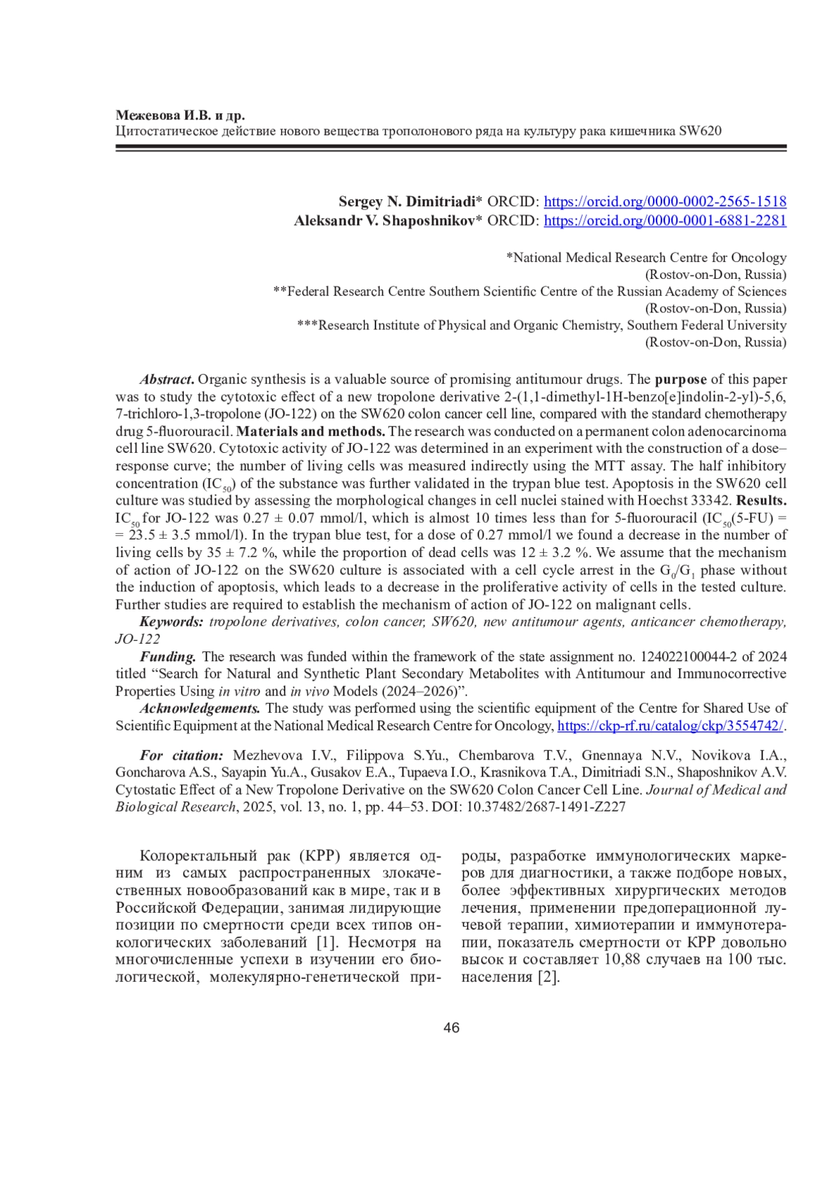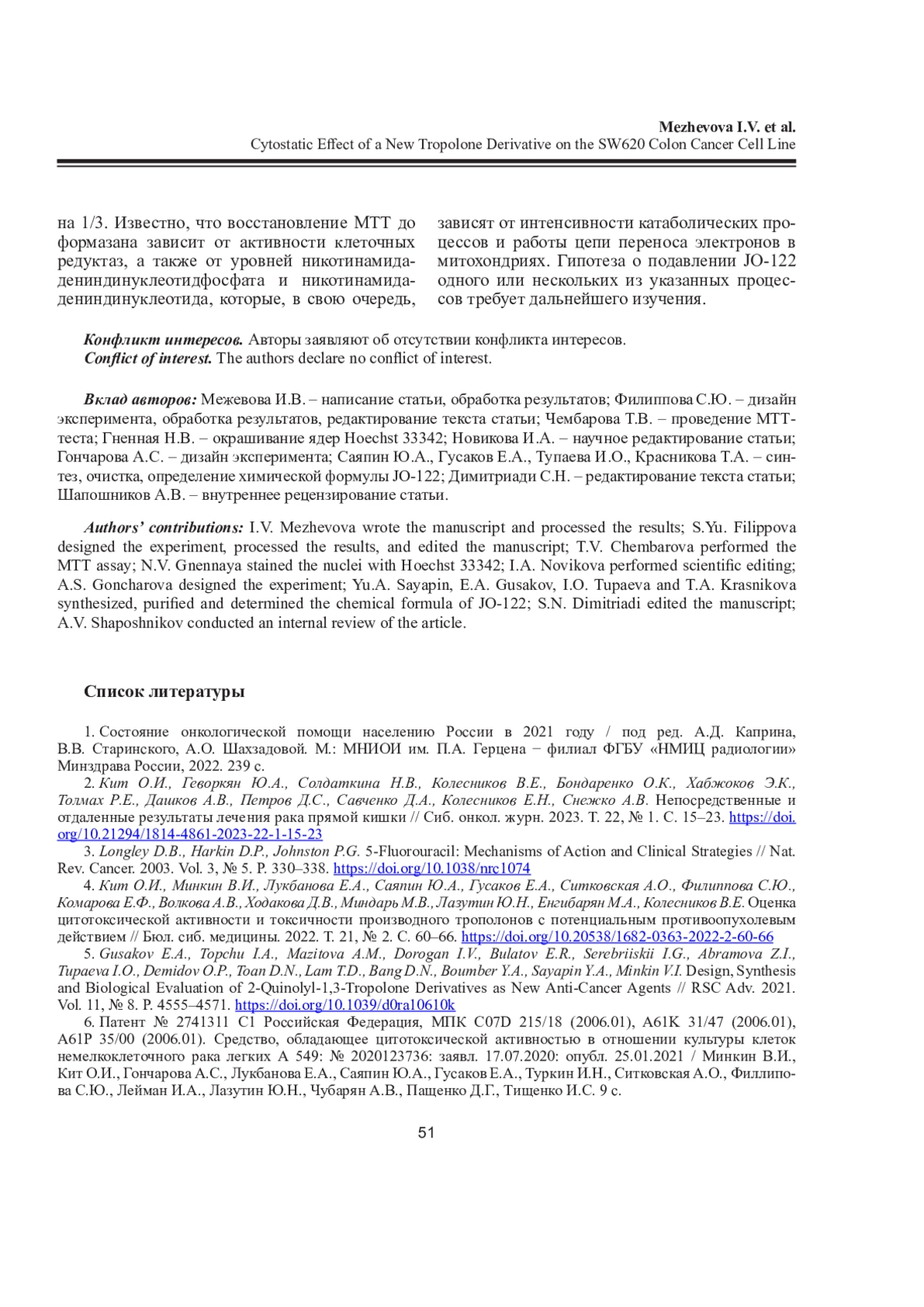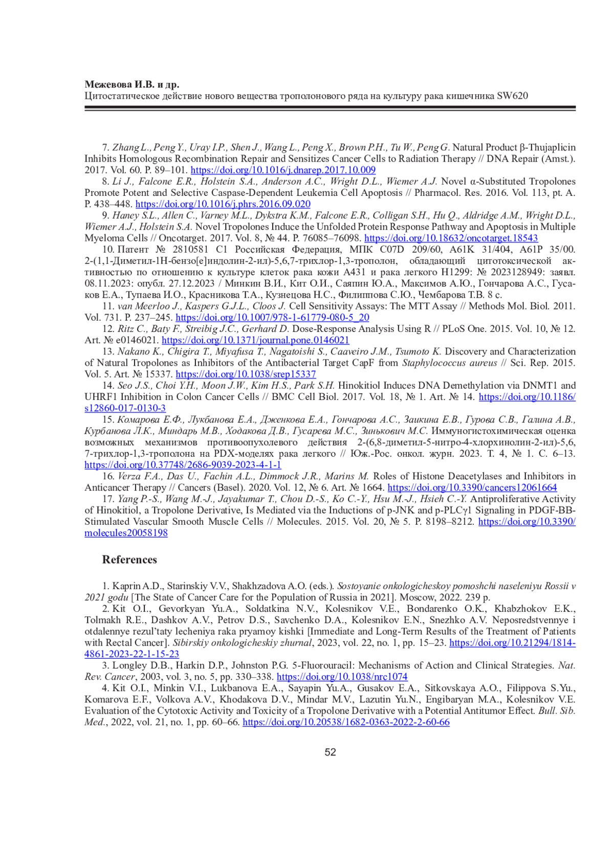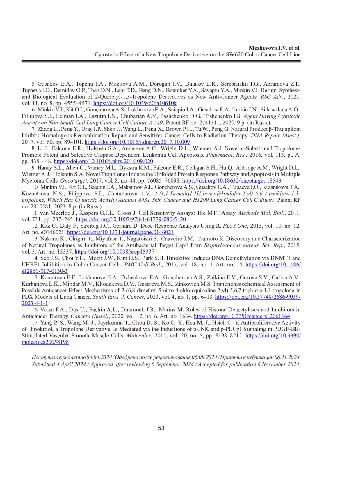 5. Gusakov E.A., Topchu I.A., Mazitova A.M., Dorogan I.V., Bulatov E.R., Serebriiskii I.G., Abramova Z.I., Tupaeva I.O., Demidov O.P., Toan D.N., Lam T.D., Bang D.N., Boumber Y.A., Sayapin Y.A., Minkin V.I. Design, Synthesis and Biological Evaluation of 2-Quinolyl-1,3-Tropolone Derivatives as New Anti-Cancer Agents // RSC Adv. 2021. Vo l. 11, No 8. P. 4555-4571. DOI: 10.1039/d0ra10610k