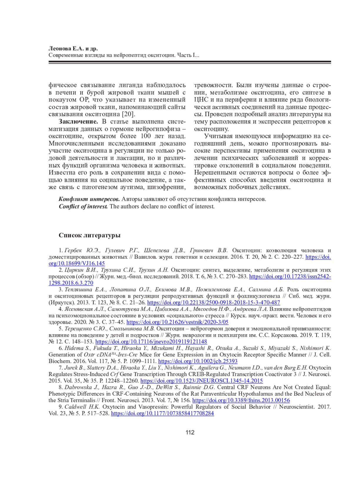 1. Гербек Ю.Э., Гулевич Р.Г., Шепелева Д.В., Гриневич В.В. Окситоцин: коэволюция человека и доместицированных животных // Вавилов. журн. генетики и селекции. 2016. Т. 20, No 2. С. 220-227. DOI: 10.18699/VJ16.145 EDN: WLVJZV
