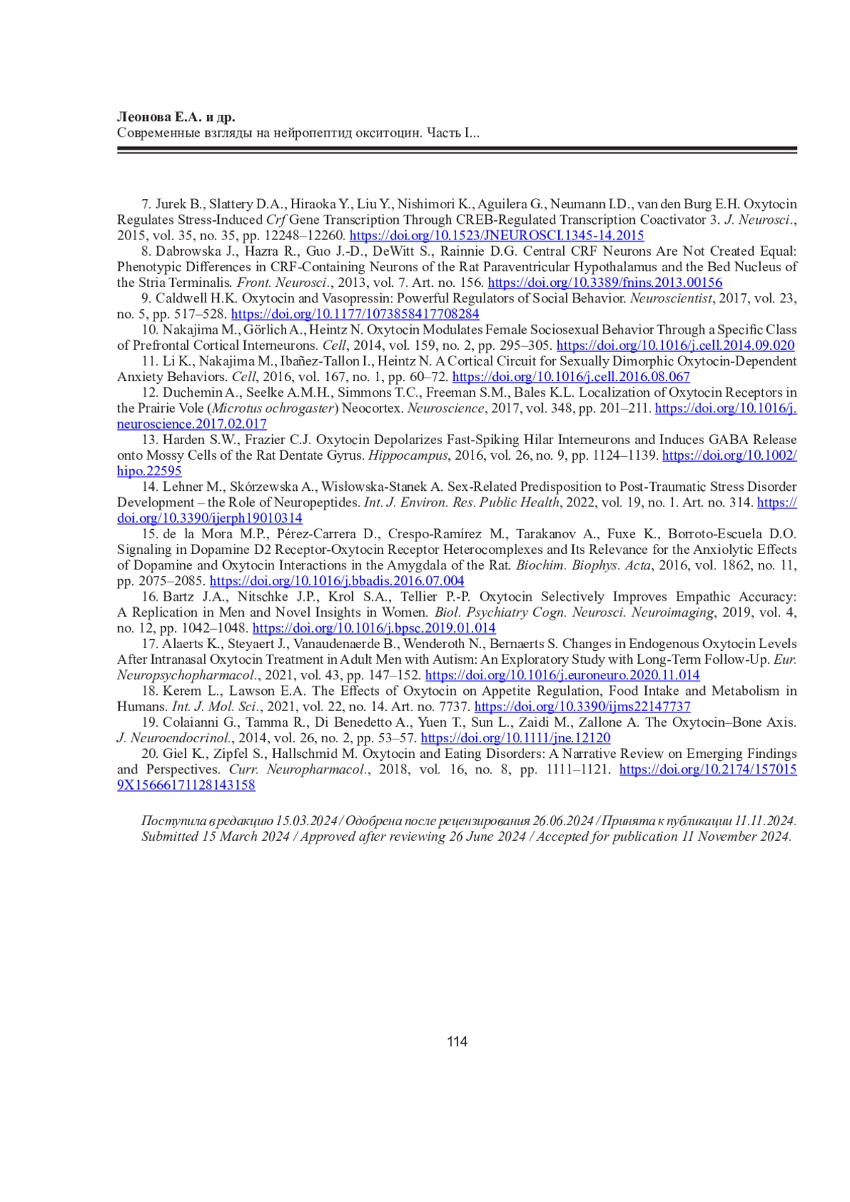 17. Alaerts K., Steyaert J., Vanaudenaerde B., Wenderoth N., Bernaerts S. Changes in Endogenous Oxytocin Levels After Intranasal Oxytocin Treatment in Adult Men with Autism: An Exploratory Study with Long-Term Follow-Up // Eur. Neuropsychopharmacol. 2021. Vol. 43. Р. 147-152. DOI: 10.1016/j.euroneuro.2020.11.014 EDN: CITCXO