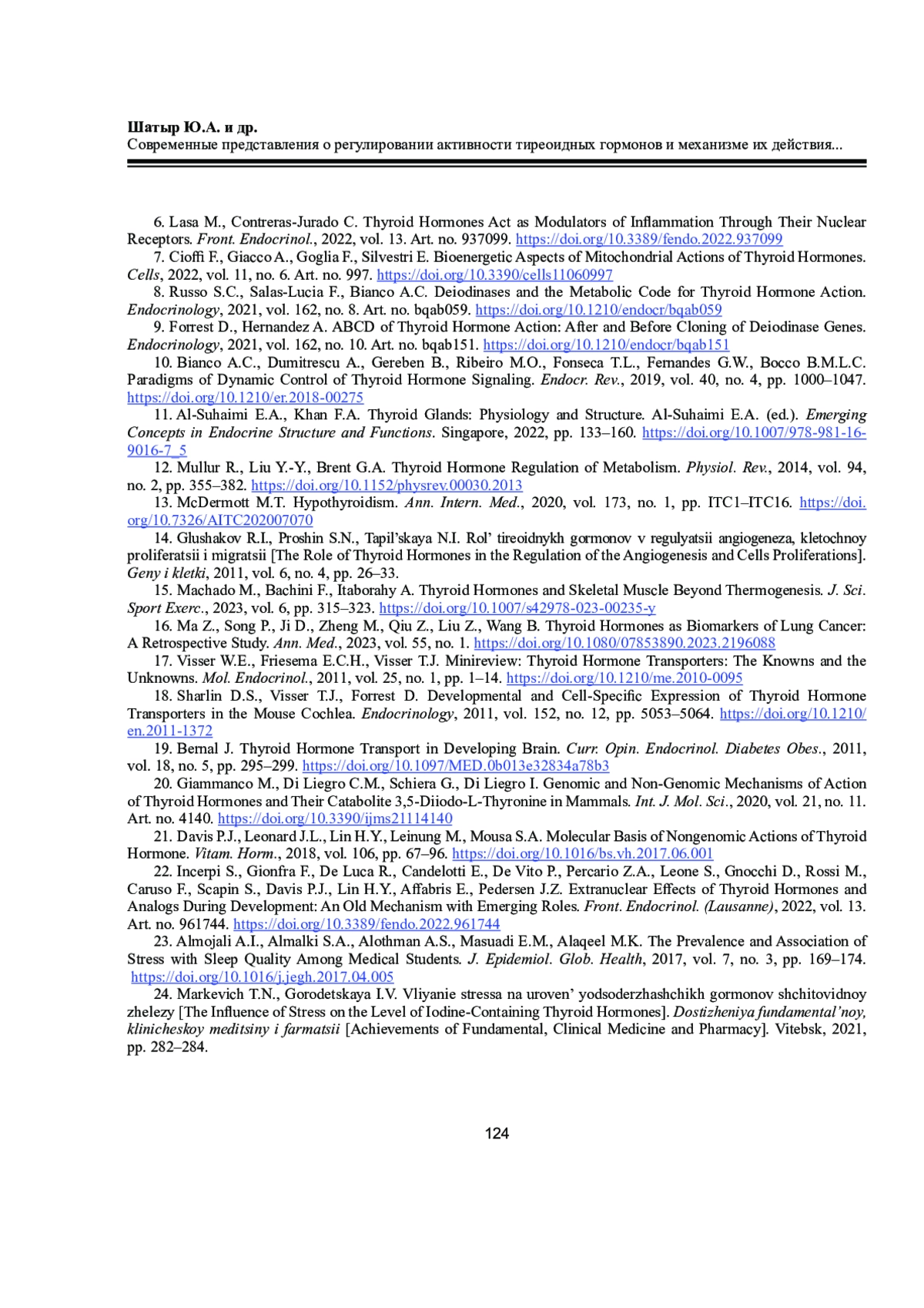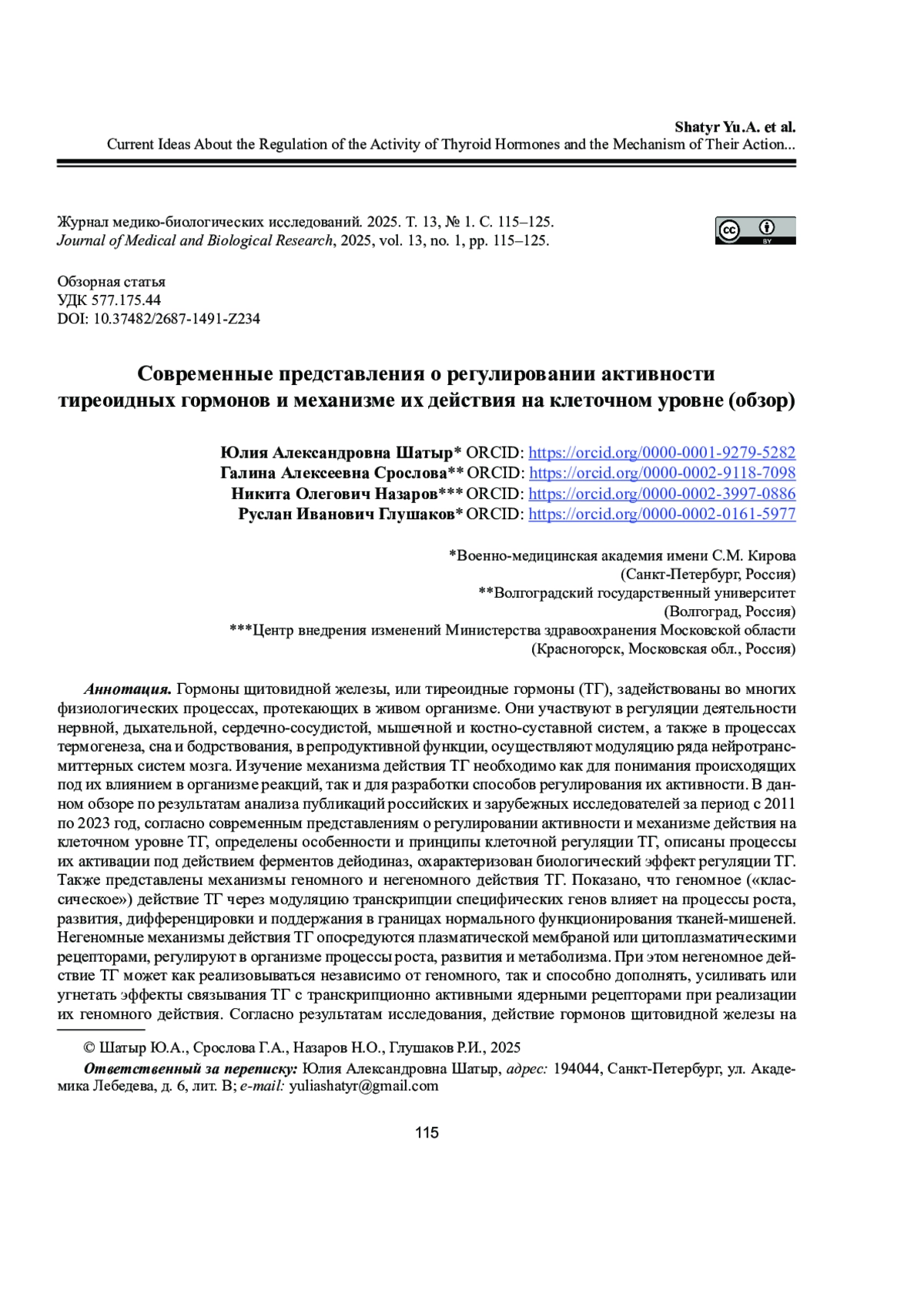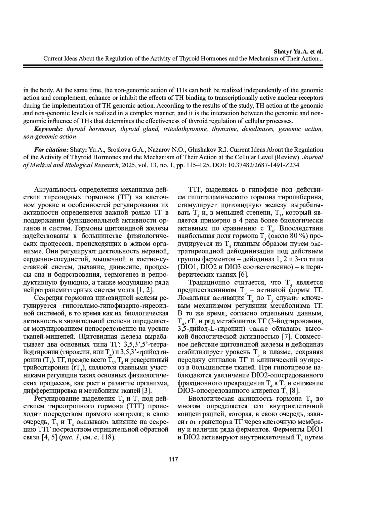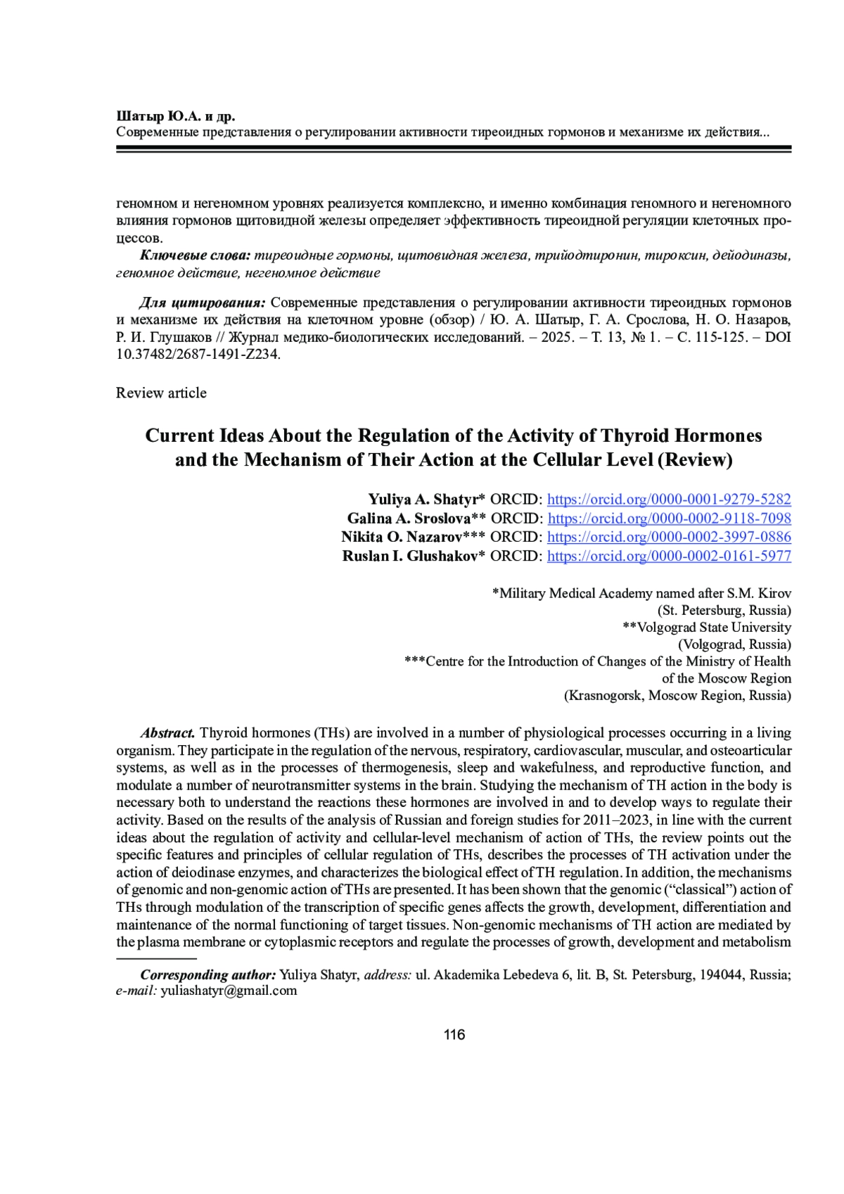 ШАТЫР Ю. А., СРОСЛОВА Г. А., НАЗАРОВ Н. О., ГЛУШАКОВ Р. И. СОВРЕМЕННЫЕ ПРЕДСТАВЛЕНИЯ О РЕГУЛИРОВАНИИ АКТИВНОСТИ ТИРЕОИДНЫХ ГОРМОНОВ И МЕХАНИЗМЕ ИХ ДЕЙСТВИЯ НА КЛЕТОЧНОМ УРОВНЕ (ОБЗОР) // ЖУРНАЛ МЕДИКО-БИОЛОГИЧЕСКИХ ИССЛЕДОВАНИЙ. 2025. Т. 13 № 1