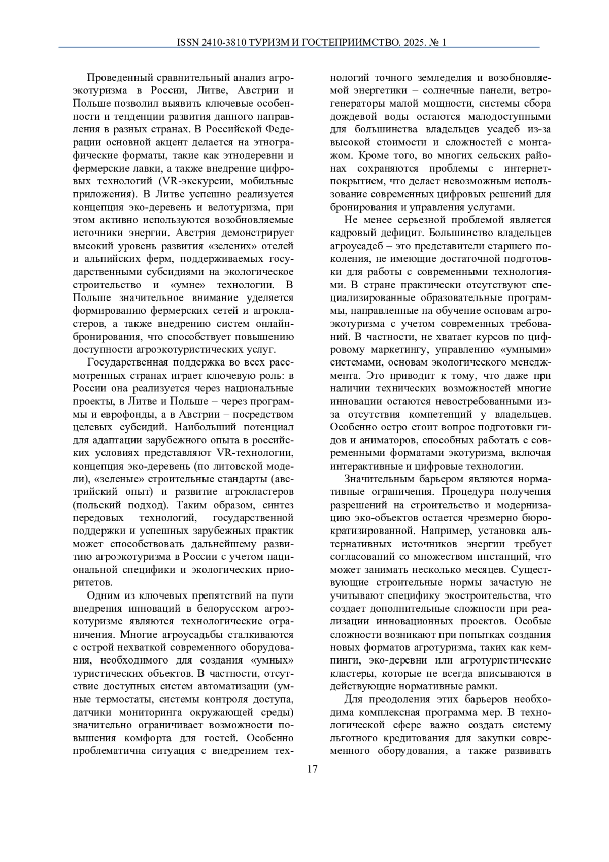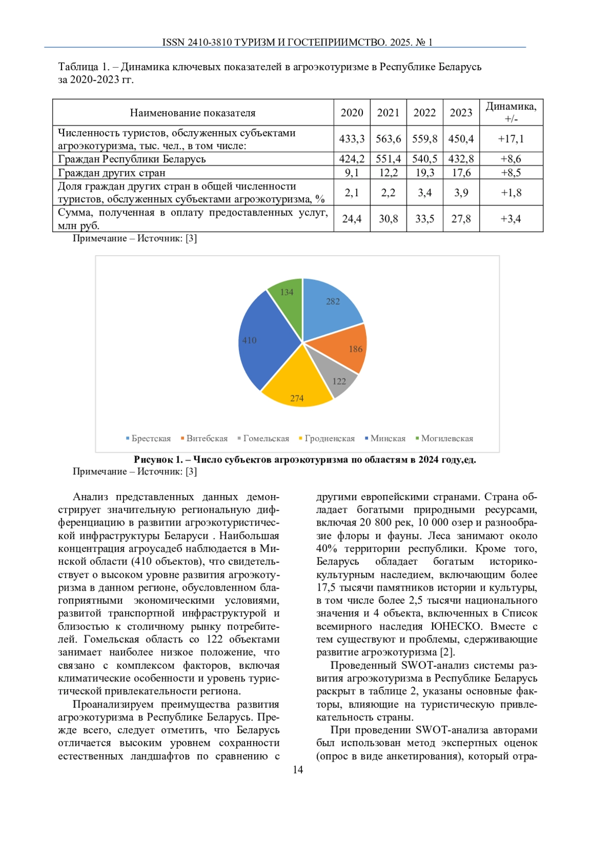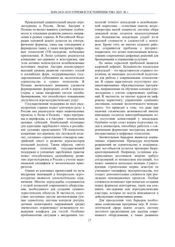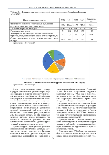 Научная статья посвящена исследованию имплементации инноваций в сфере агроэкотуризма в Республике Беларусь. Целью исследования является анализ существующих инновационных подходов и технологий, применяемых в развитии агроэкотуризма в стране, а также определение их влияния на экономику, устойчивое развитие и привлекательность данного сектора. В работе используются статистические данные и аналитические методы. В результате анализа выявления тенденции развития динамики ключевых показателей в агроэкотуризме в Республике Беларусь за 2020-2023 гг. приведено число субъектов агроэкотуризма по областям в 2024 г., проведен SWOTанализ развития агроэкотуризма в Республике Беларусь, предложены основные аспекты инноваций в сфере агроэкотуризма в Республике Беларусь, проведен анализ зарубежного опыта в агроэкотуризме. В результате исследования выялены основные препятствия для внедрения инноваций в агроэкотуризм Республики Беларусь, предложены меры по их преодолению. В результате исследования было установлено, что в Республике Беларусь происходит активное развитие инноваций в агроэкотуризме, что способствует улучшению услуг, привлекательности для туристов и устойчивому развитию данной сферы.