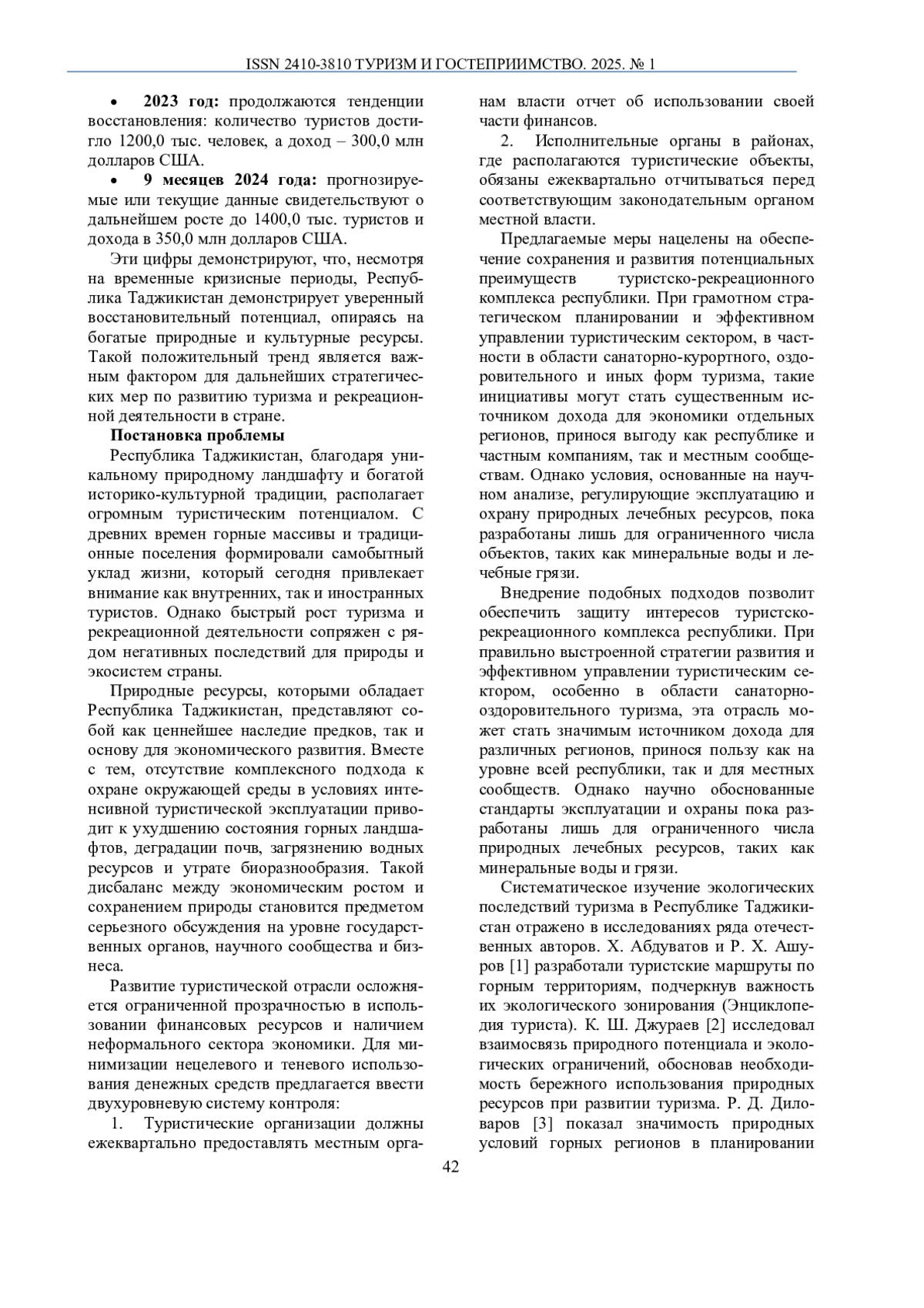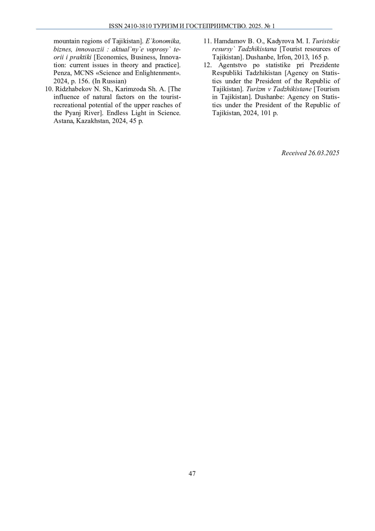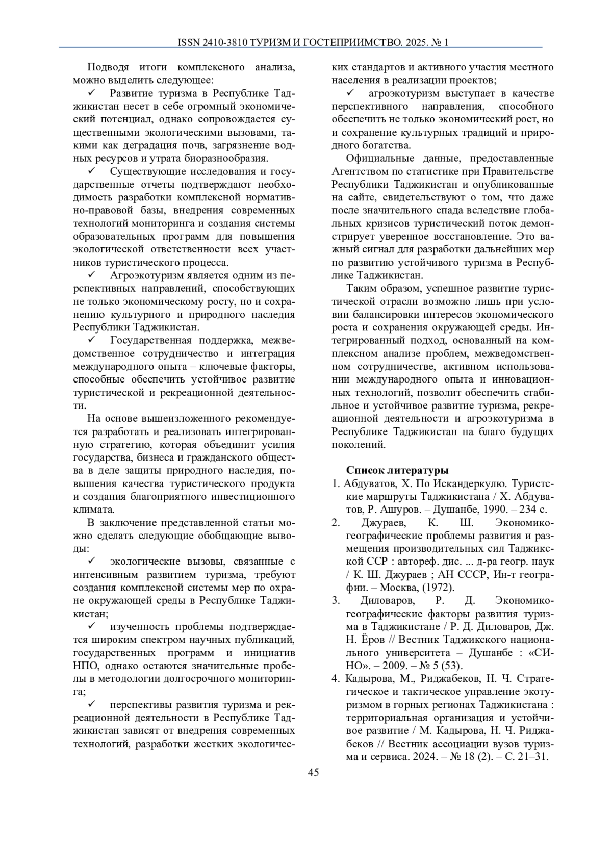 10. Риджбеков, Н. Ш. Влияние природных факторов на туристско-рекреационный потенциал верховья реки Пяндж / Н. Ш. Риджбеков, Ш. А. Каримзода // Международный научный журнал “Endless Light in Science”, Астана, Казахстан, 2024. - 45 с.