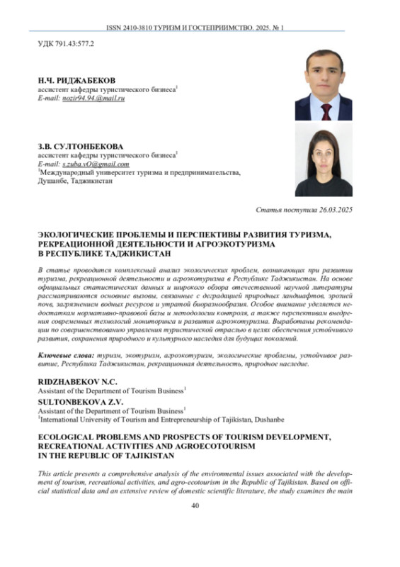 8. Риджабеков, Н. Ч. Проблемы территориальной организации экологического туризма в горных условиях Таджикистана / Н. Ч. Риджабеков, Р. Диловаров // Вестник Таджикского национального университета. -2024. - №. 11. - С. 53-59.