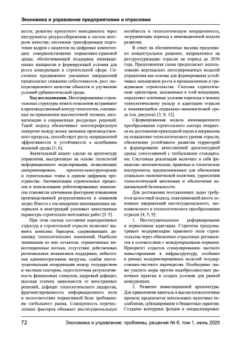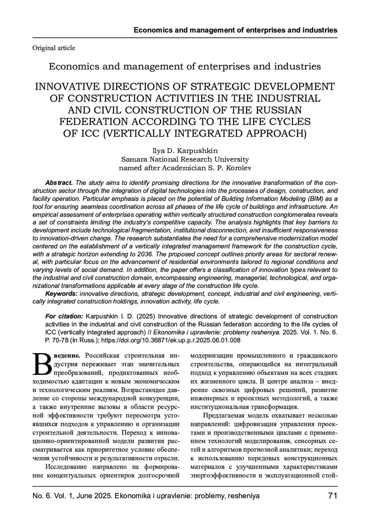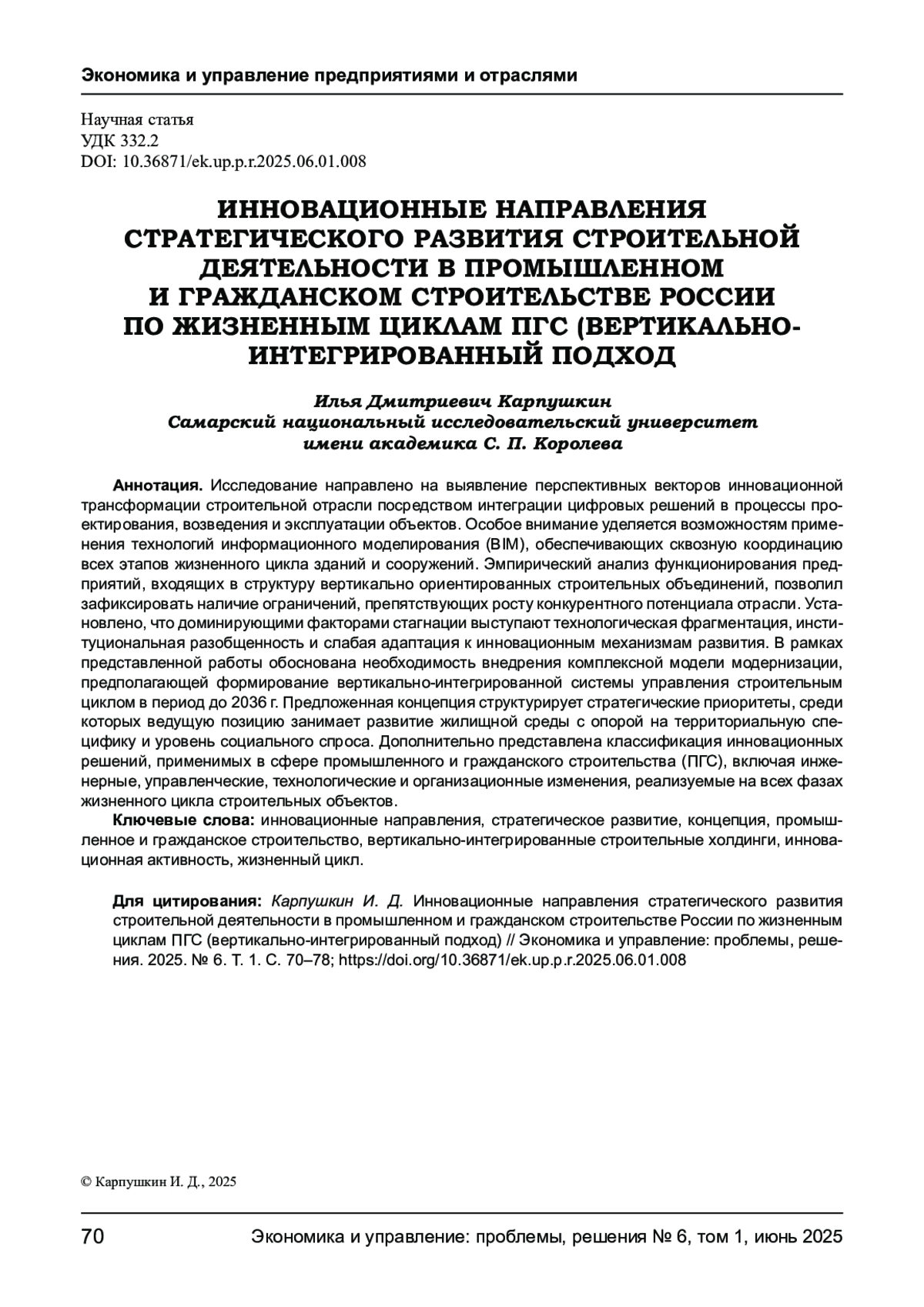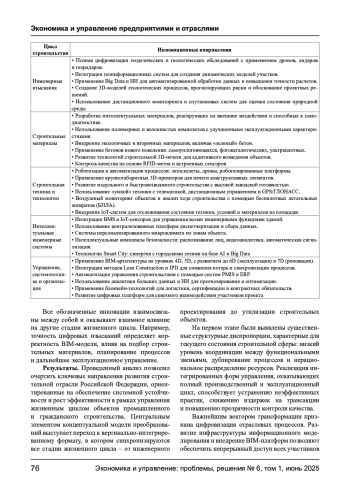 Исследование направлено на выявление перспективных векторов инновационной трансформации строительной отрасли посредством интеграции цифровых решений в процессы проектирования, возведения и эксплуатации объектов. Особое внимание уделяется возможностям применения технологий информационного моделирования (BIM), обеспечивающих сквозную координацию всех этапов жизненного цикла зданий и сооружений. Эмпирический анализ функционирования предприятий, входящих в структуру вертикально ориентированных строительных объединений, позволил зафиксировать наличие ограничений, препятствующих росту конкурентного потенциала отрасли. Установлено, что доминирующими факторами стагнации выступают технологическая фрагментация, институциональная разобщенность и слабая адаптация к инновационным механизмам развития. В рамках представленной работы обоснована необходимость внедрения комплексной модели модернизации, предполагающей формирование вертикально-интегрированной системы управления строительным циклом в период до 2036 г. Предложенная концепция структурирует стратегические приоритеты, среди которых ведущую позицию занимает развитие жилищной среды с опорой на территориальную специфику и уровень социального спроса. Дополнительно представлена классификация инновационных решений, применимых в сфере промышленного и гражданского строительства (ПГС), включая инженерные, управленческие, технологические и организационные изменения, реализуемые на всех фазах жизненного цикла строительных объектов.