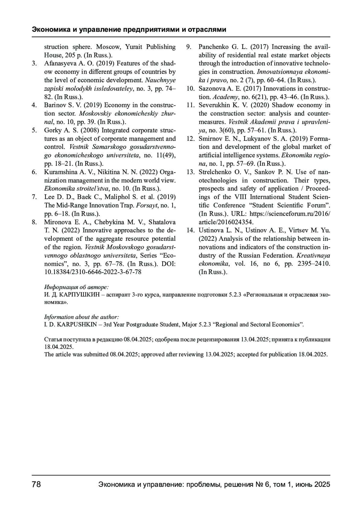 4. Баринов С. В. Экономика в строительной сфере // Московский экономический журнал. 2019. № 10. C. 39. EDN: WUODWE