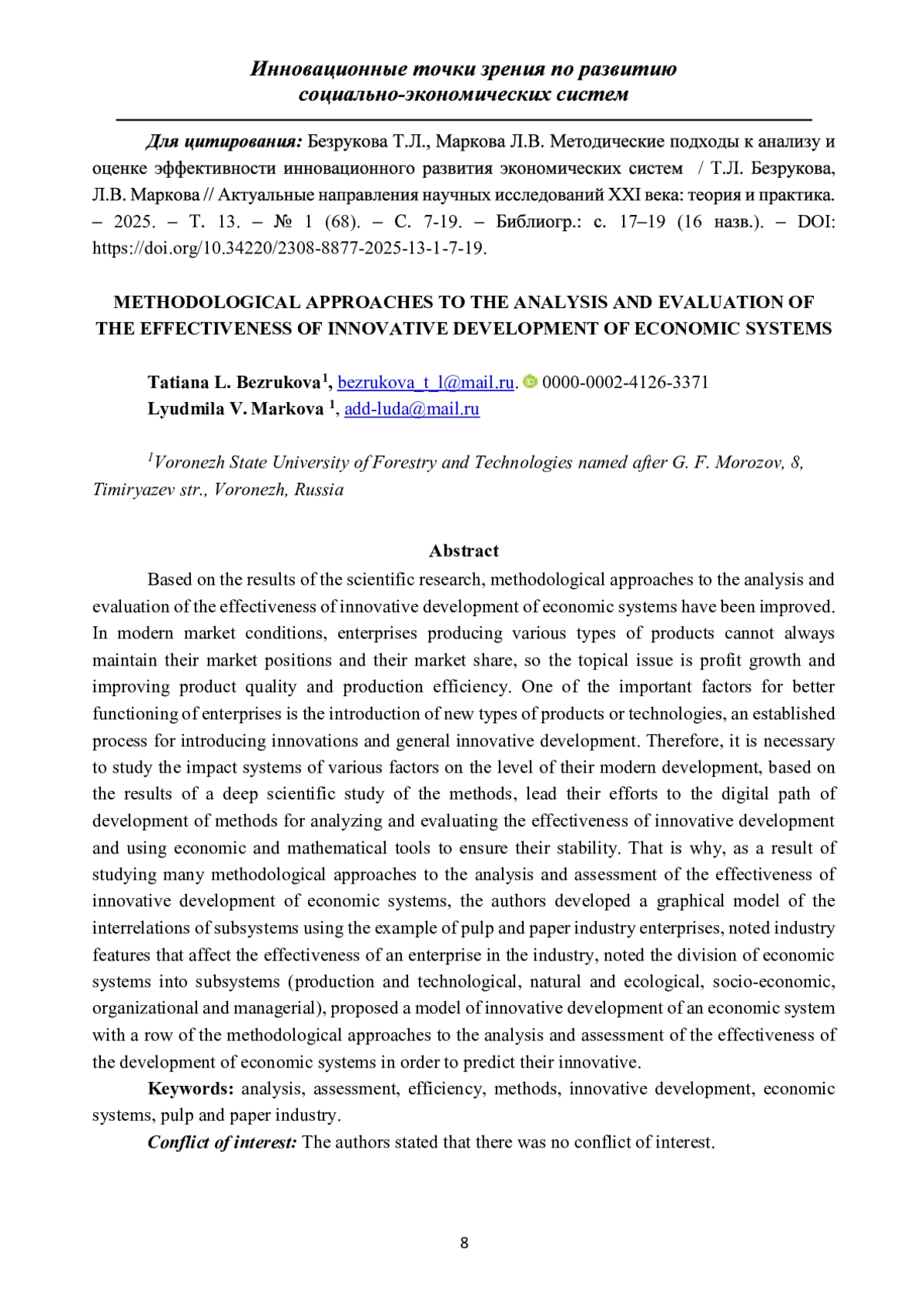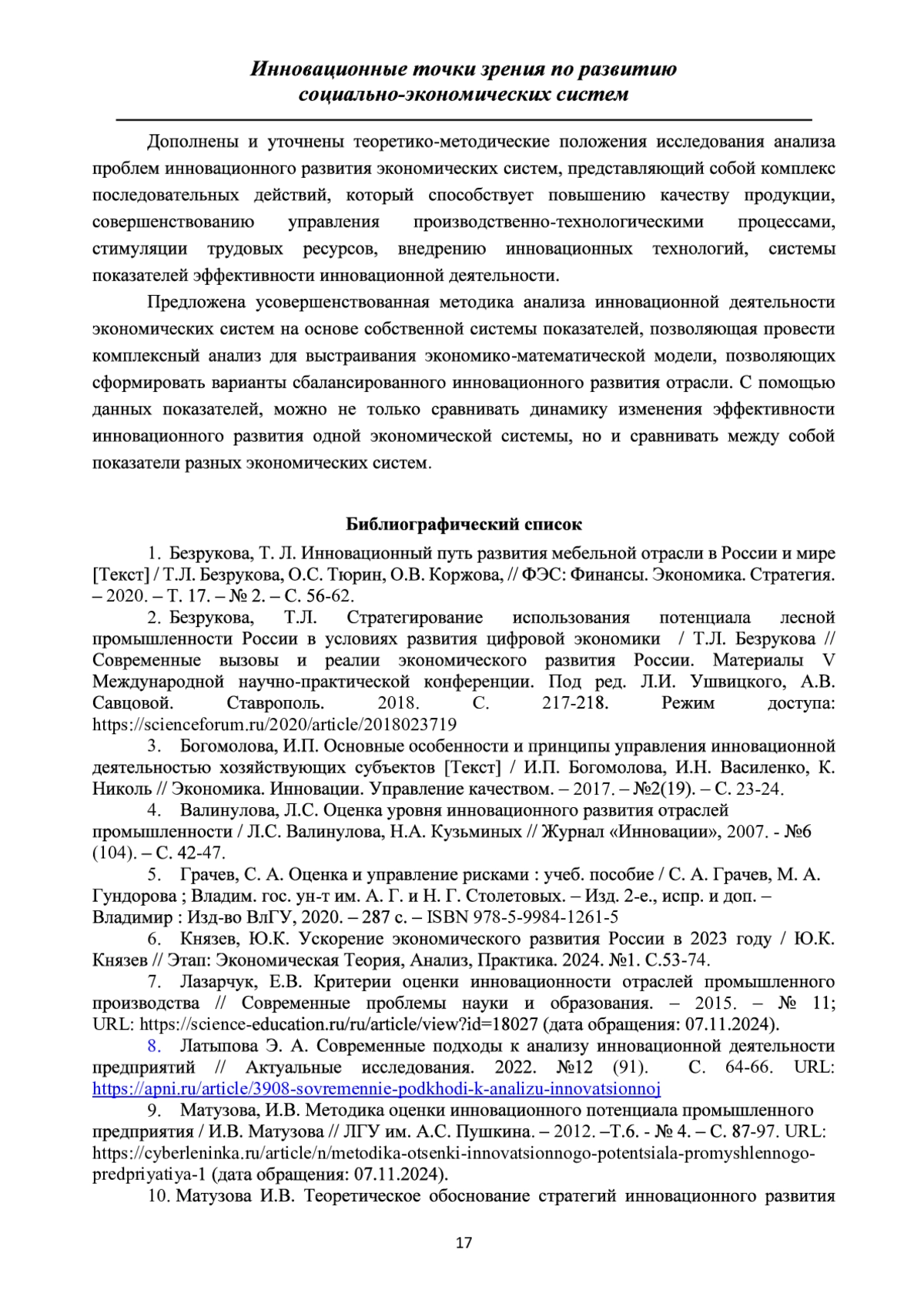 16. Bezrukova, T. L., Larionov V. G., Zinovyeva I. S., Kuksova I. V. Assessment of innovation impact on the economic development of the forest complex // In the collection: Proceedings of the 33rd International Business Information Management Association Conference, IBIMA 2019: Education Excellence and Innovation Management through Vision 2020. 33, Education Excellence and Innovation Management through Vision 2020. 2019. С. 3822-3828. EDN: DVNOQX