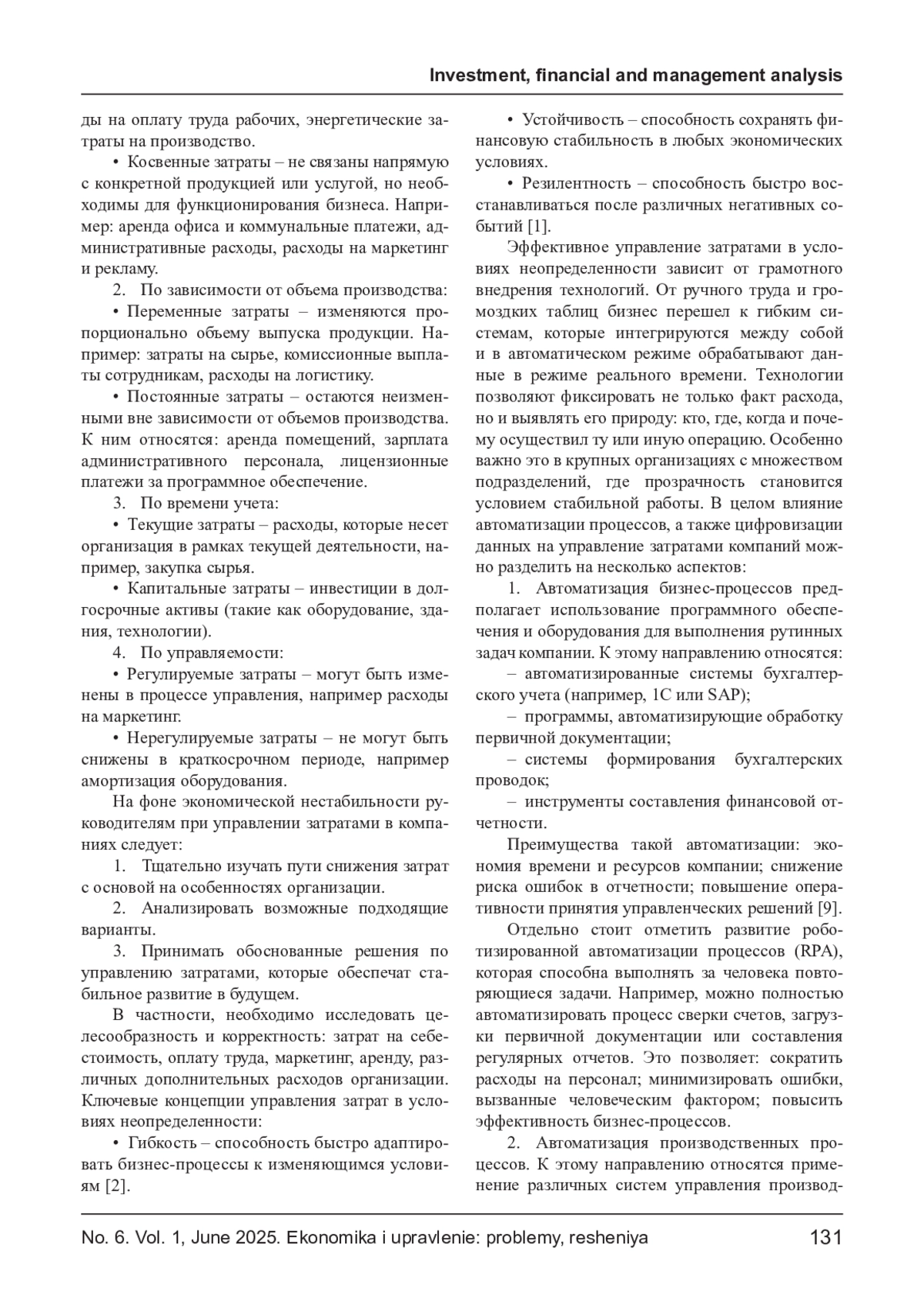 3. Григорян Ю. А. Аналитический обзор методов управления затратами и себестоимостью продукции организации // Экономика и бизнес: теория и практика. 2020. № 2-1 (60). С. 71-74. EDN: WMQPNF