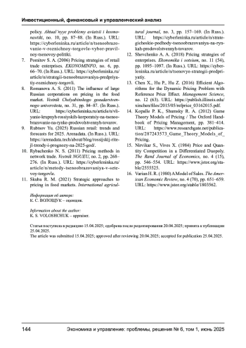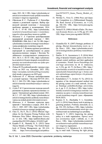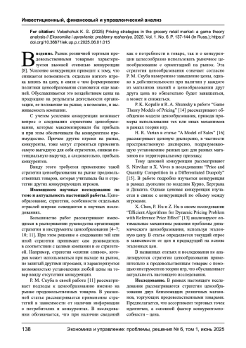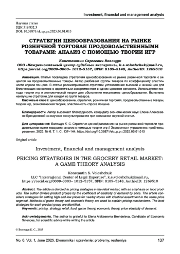 ВОЛОЩУК К. С. СТРАТЕГИИ ЦЕНООБРАЗОВАНИЯ НА РЫНКЕ РОЗНИЧНОЙ ТОРГОВЛИ ПРОДОВОЛЬСТВЕННЫМИ ТОВАРАМИ: АНАЛИЗ С ПОМОЩЬЮ ТЕОРИИ ИГР // ЭКОНОМИКА И УПРАВЛЕНИЕ: ПРОБЛЕМЫ, РЕШЕНИЯ. 2025. ТОМ 1 № 6