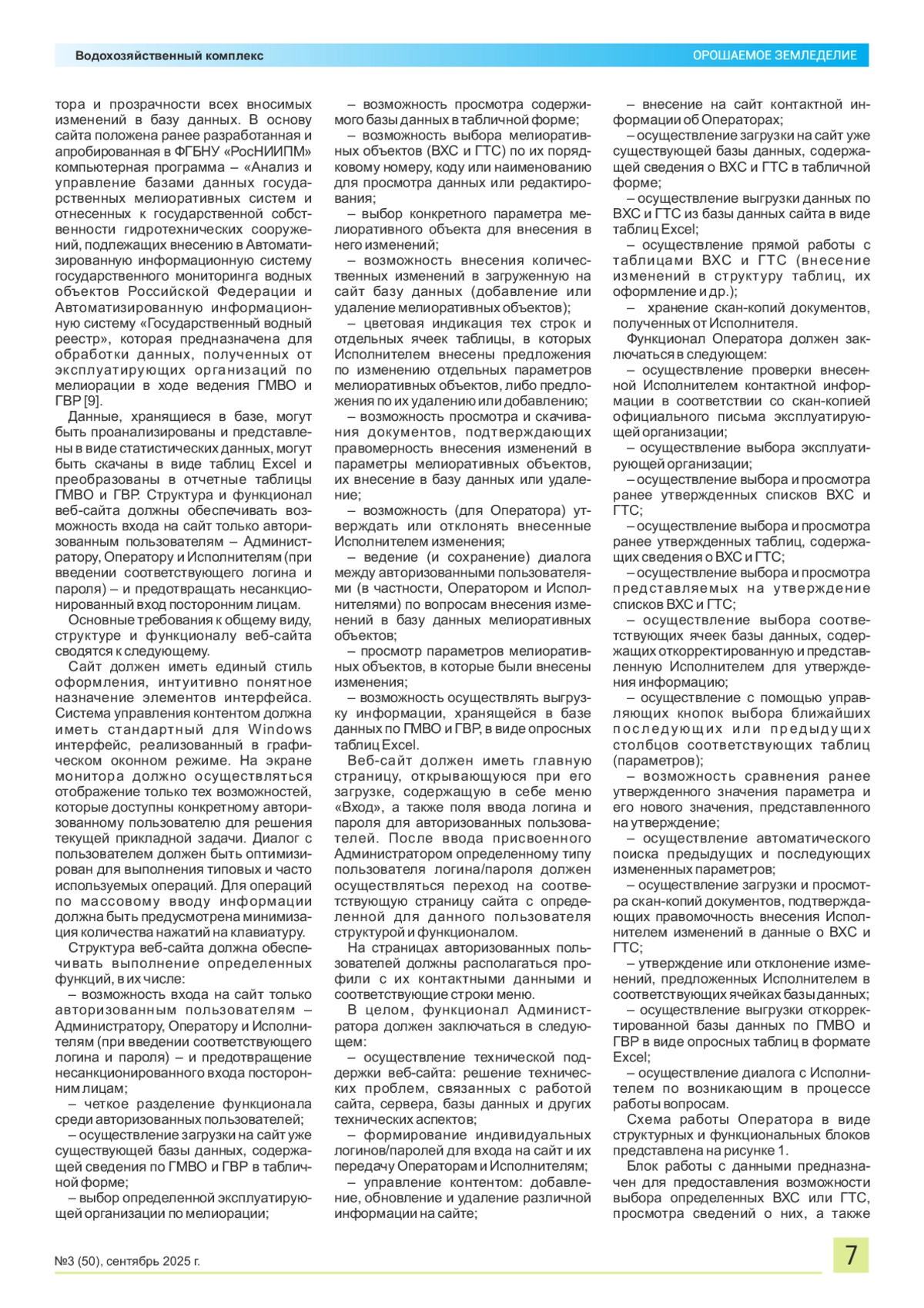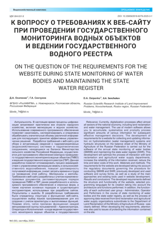 В настоящее время процессы цифровизации затрагивают практически все отрасли народного хозяйства, включая мелиорацию и водное хозяйство. Использование современного программного обеспечения позволяет накапливать, систематизировать и оперативно обрабатывать значительные объемы различной информации для последующего принятия эффективных управленческих решений. Разработка требований к веб-сайту для сбора и актуализации сведений о гидромелиоративных (водохозяйственных) системах и гидротехнических сооружениях, находящихся на балансе Министерства сельского хозяйства Российской Федерации, осуществляется для программного обеспечения ежегодно проводимого государственного мониторинга водных объектов (ГМВО) и ведения государственного водного реестра (ГВР). Данная разработка позволит оптимизировать процесс взаимодействия с управлениями мелиорации земель и сельскохозяйственного водоснабжения, повысит достоверность получаемой информации, снизит затраты времени и труда на проведение этой работы. Материалы и методы. Требования к веб-сайту разработаны с учетом нормативноправовых документов, регламентирующих порядок проведения ГМВО и ГВР; ранее разработанного и используемого программного обеспечения и опросных форм, а также изучения основных подходов и существующего инструментария, используемых при разработке сайтов. Результаты и выводы. В разработанных требованиях были определены структура и функционал веб-сайта, осуществлен выбор языков программирования для его создания с учетом архитектуры и выполняемых функций. Помимо этого, четко прописан функционал каждой авторизованной группы пользователей – Администратора, Оператора и Исполнителей – в ходе ведения государственного мониторинга водных объектов и государственного водного реестра, а также процесс утверждения данных, поступающих от организаций по мелиорации земель и сельскохозяйственному водоснабжению, подведомственных Депмелиорации Минсельхоза России. При разработке требований также было уделено внимание вопросам защиты содержащейся на сайте информации.