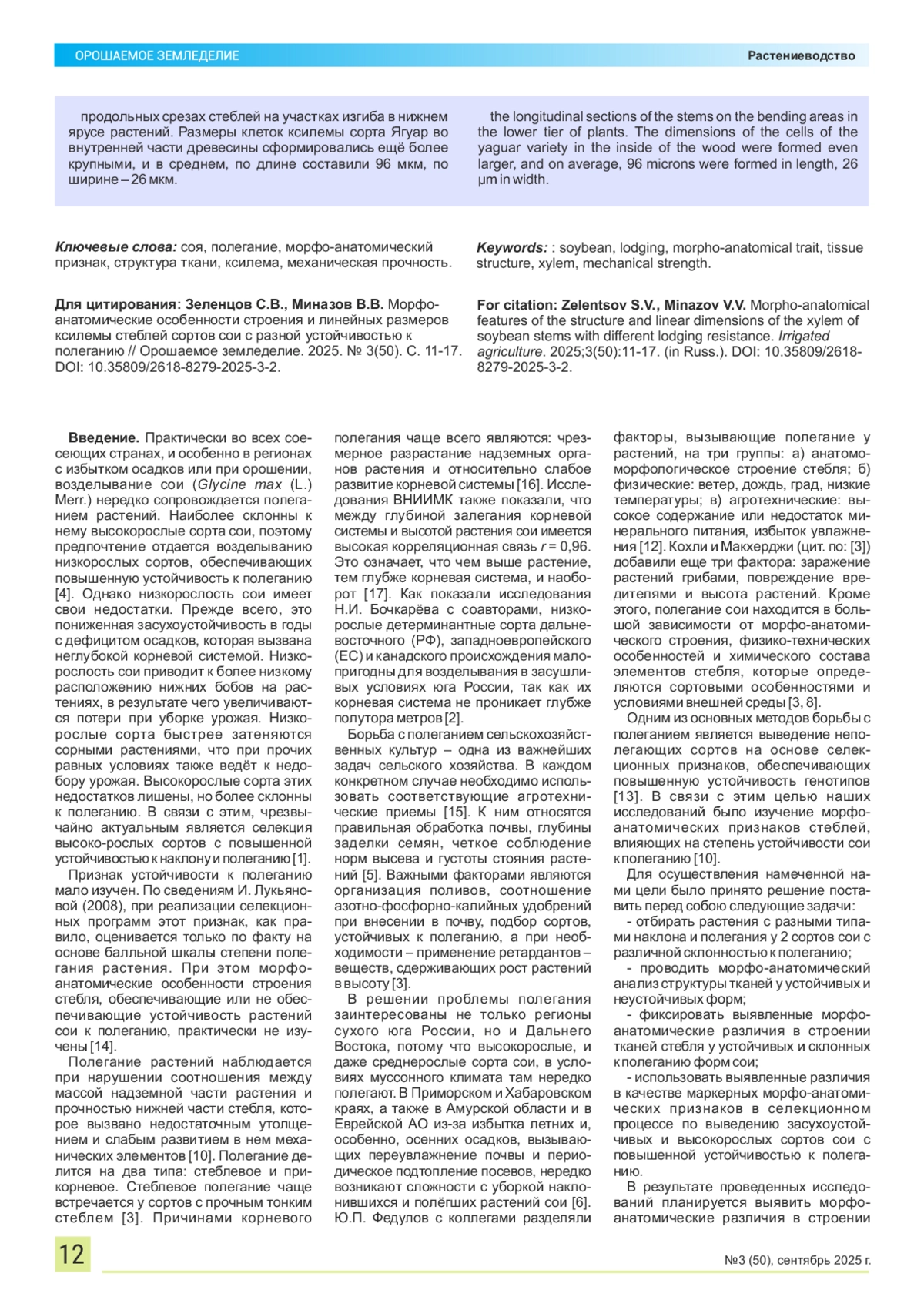 6. Зеленцов С.В., Коршунова А.Ф. Сравнительный анализ структуры ксилемы у сортов сои с разной устойчивостью к полеганию // Вестник Российской академии сельскохозяйственных наук. 2019. № 4. С. 45-50. References.