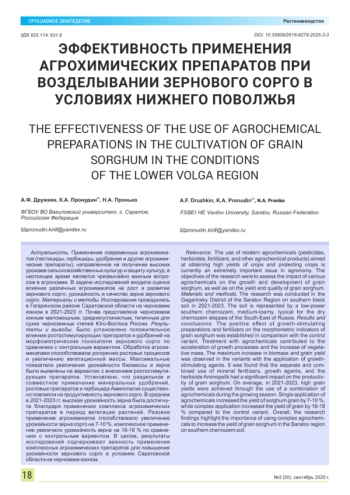 Применение современных агрохимикатов (пестициды, гербициды, удобрения и другие агрохимические препараты), направленное на получение высоких урожаев сельскохозяйственных культур и защиту культур, в настоящее время является чрезвычайно важным вопросом в агрономии. В задачи исследований входила оценка влияния различных агрохимикатов на рост и развитие зернового сорго, урожайность и качество зерна зернового сорго. Материалы и методы. Исследования проводились в Гагаринском районе Саратовской области на черноземе южном в 2021-2023 гг. Почва представлена черноземом южным маломощным, среднесуглинистым, типичным для сухих черноземных степей Юго-Востока России. Результаты и выводы. Было установлено положительное влияние ростостимулирующих препаратов и удобрений на морфометрические показатели зернового сорго по сравнению с контрольным вариантом. Обработка агрохимикатами способствовала ускорению ростовых процессов и увеличению вегетационной массы. Максимальные показатели увеличения урожайности биомассы и зерна были выявлены на вариантах с внесением ростостимулирующих препаратов. Установлено, что раздельное и совместное применение минеральных удобрений, ростовых препаратов и гербицида Аминопелик существенно повлияли на продуктивность зернового сорго. В среднем в 2021-2023 гг. высокая урожайность зерна была достигнута благодаря применению комплекса агрохимических препаратов в период вегетации растений. Разовое применение агрохимикатов способствовало увеличение урожайности зерна сорго на 7-10 %, комплексное применение увеличило урожайность зерна на 16-18 % по сравнению с контрольным вариантом. В целом, результаты исследований подчеркивают важность применения комплексных агрохимических препаратов для повышения урожайности зернового сорго в условиях Саратовской области на черноземе южном.