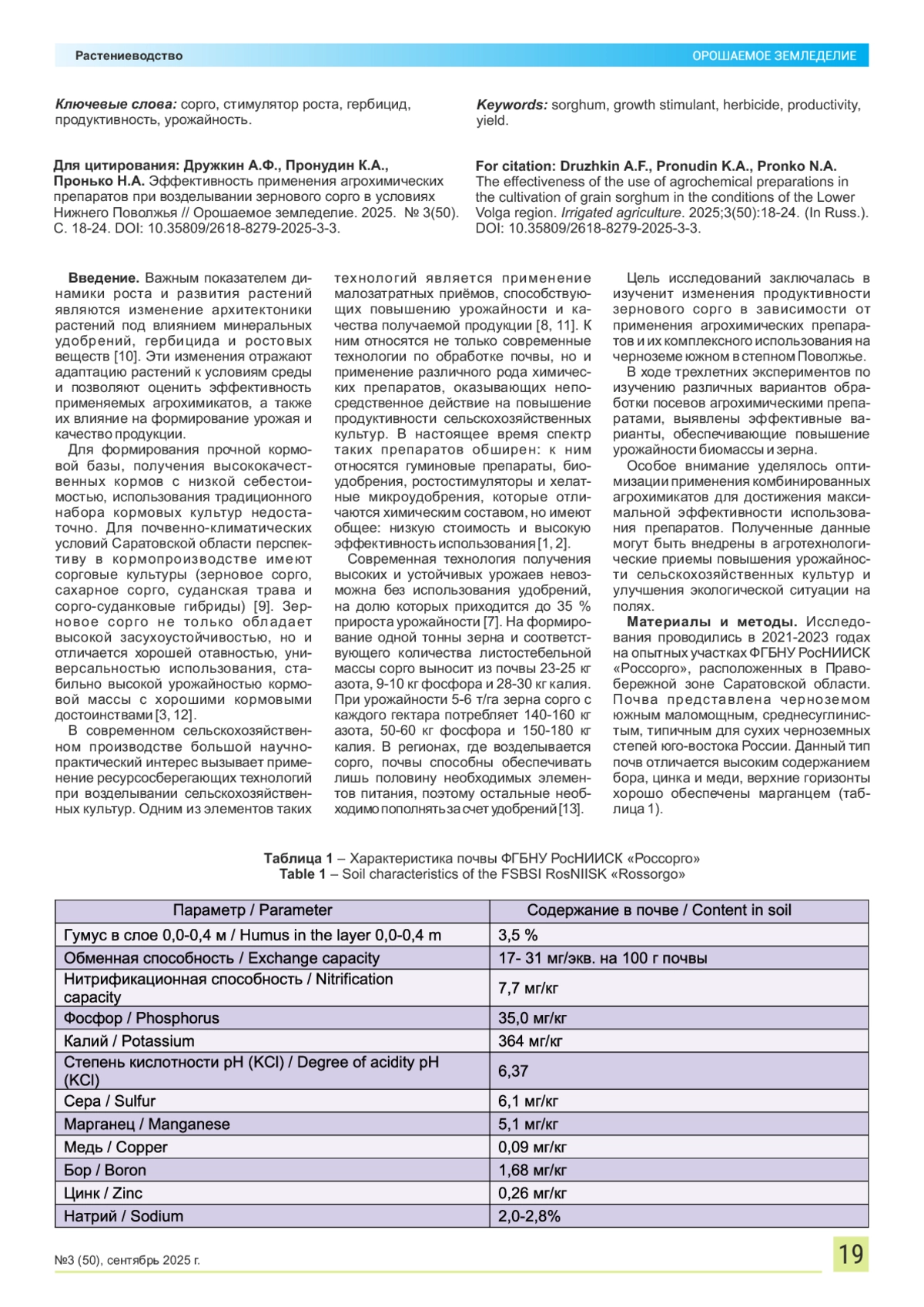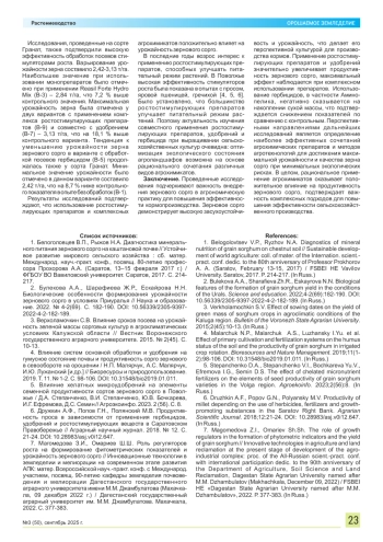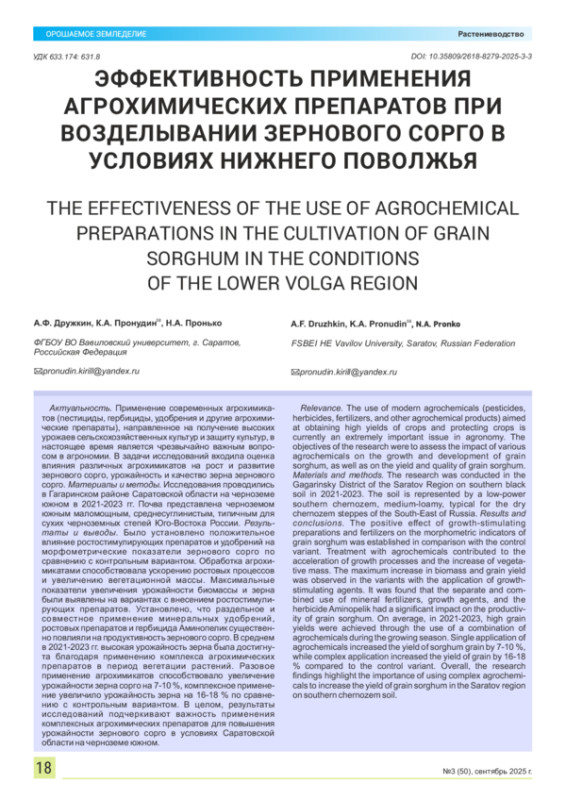 10. Пронудин К.А., Дружкин А.Ф. Влияние использования агрохимикатов на рост и урожайность зернового сорго в степном Поволжье на черноземе южном // Вавиловские чтения - 2024: сб. ст. Международ. науч.-практ. конф., посвящ. 137-й годовщине со дня рождения академика Н.И. Вавилова (Саратов, 25-29 ноября 2024 г.) / ФГБОУ ВО Вавиловский университет. Саратов, 2024. С. 235-239.