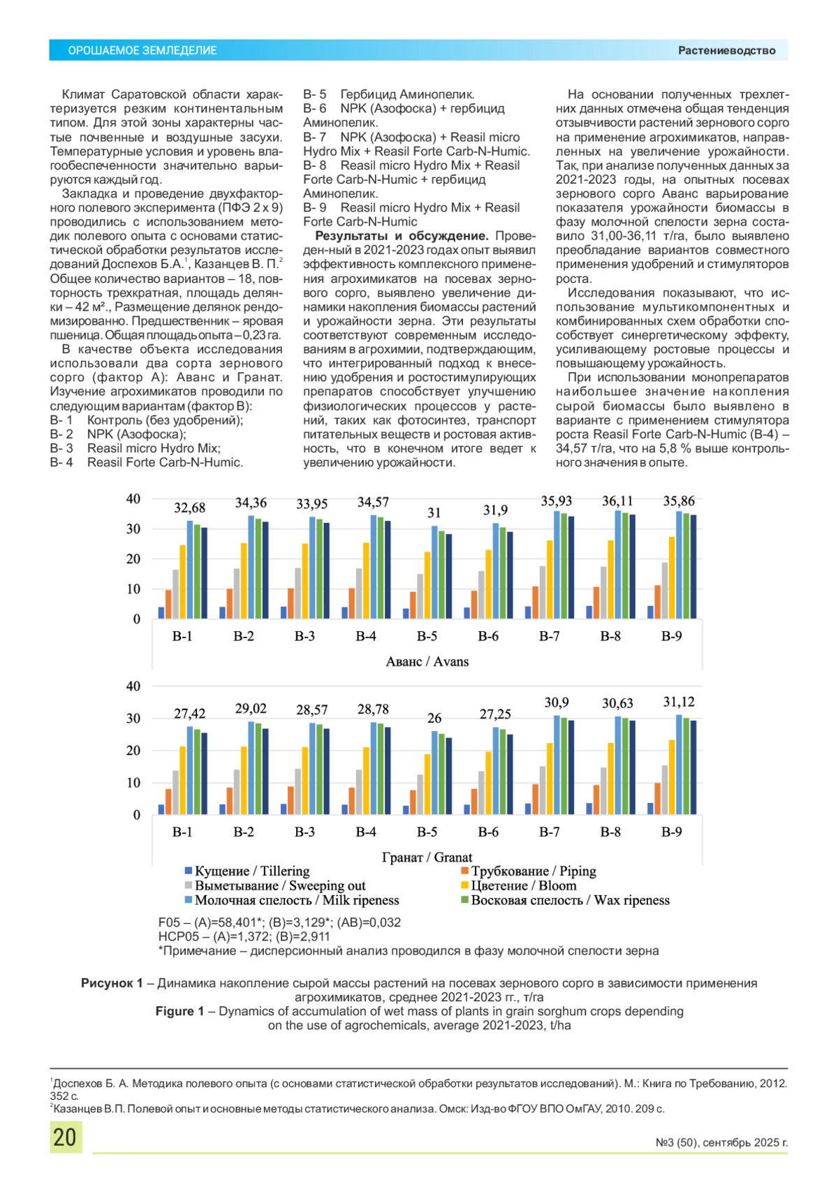 9. Оценка биохимического состава зерна сорго в зависимости от метеоусловий года, в котором получен урожай / И.А. Сазонова, В.В. Бычкова, А.В. Ерохина, Ю.В. Бочкарева // Орошаемое земледелие. 2022. № 3(38). С. 35-39. DOI: 10.35809/2618-8279-2022-3-8