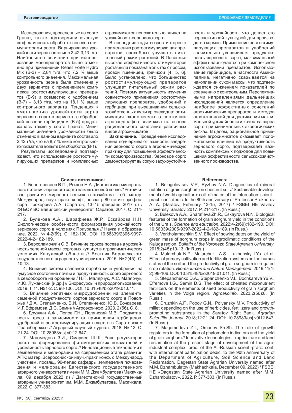 7. Магомедова З.И., Омариев Ш.Ш. Роль регуляторов роста на формирование фитометрических показателей и урожайность зернового сорго // Инновационные технологии в земледелии и мелиорации на современном этапе развития АПК: матер. Всероссийской науч.-практ. конф. с Международ. участием, посвящ. 90-летию кафедры земледелия почвоведения и мелиорации Дагестанского ГАУ им. М.М. Джамбулатова (Махачкала, 09 декабря 2022 г.) / Дагестанский ГАУ им. М.М. Джамбулатова. Махачкала, 2022. С. 377-383.