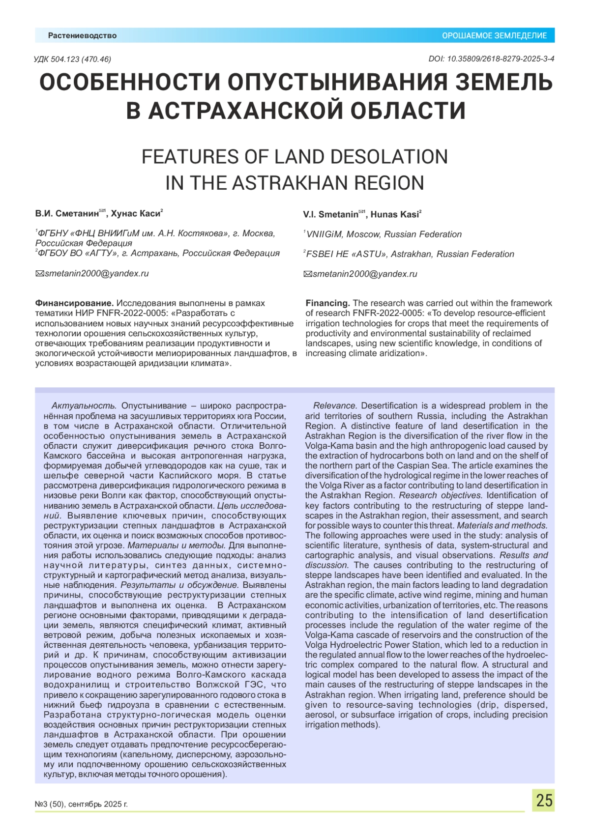 9. Сметанин В.И., Каси Хунас. Проблема опустынивания земель как один из основных вызовов современному человечеству // Природообустройство. 2024. №3. С. 44-52.
