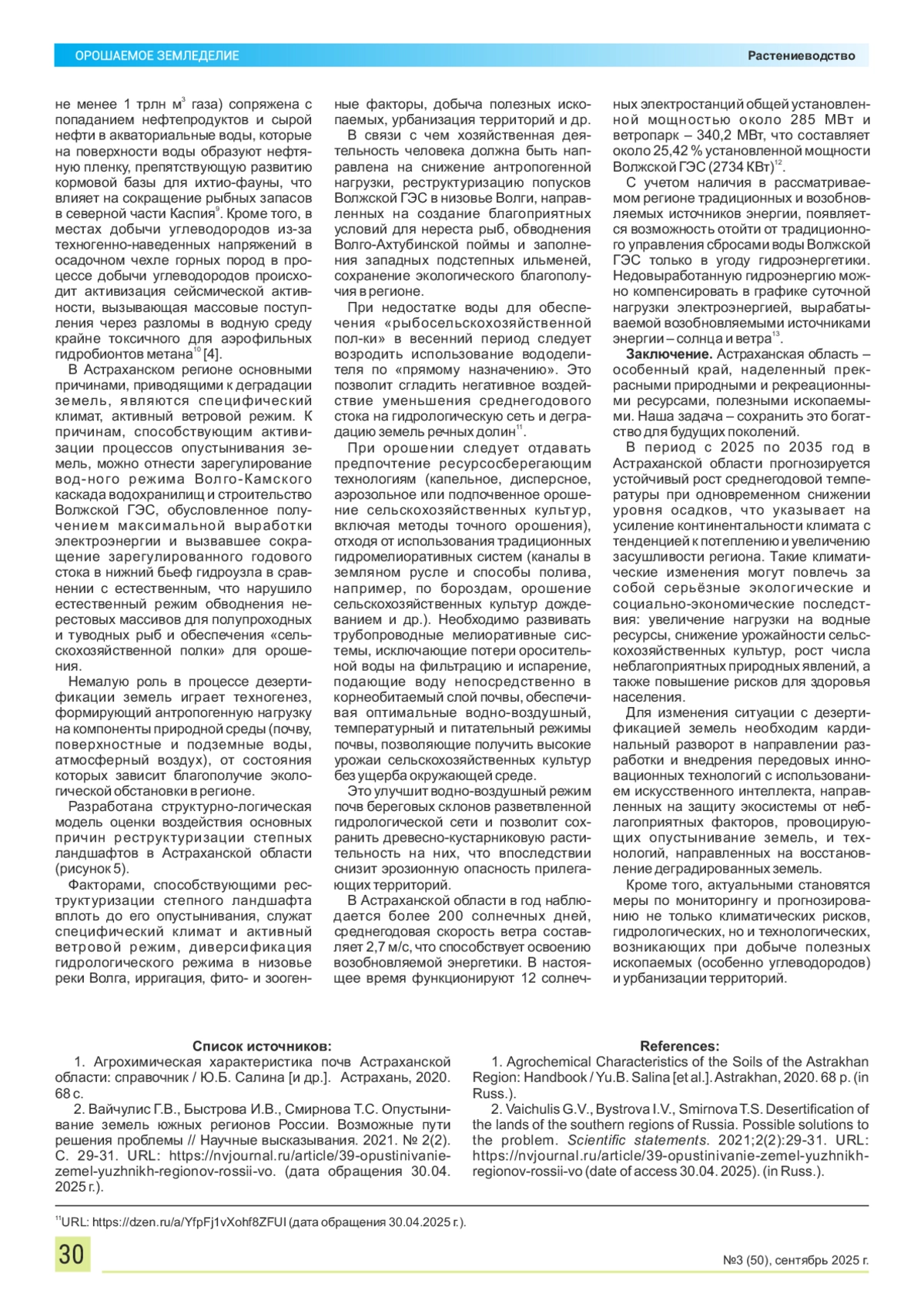2. Вайчулис Г.В., Быстрова И.В., Смирнова Т.С. Опустынивание земель южных регионов России. Возможные пути решения проблемы // Научные высказывания. 2021. № 2(2). С. 29-31. URL: https://nvjournal.ru/article/39-opustinivanie-zemel-yuzhnikh-regionov-rossii-vo. (дата обращения 30.04. 2025 г.).