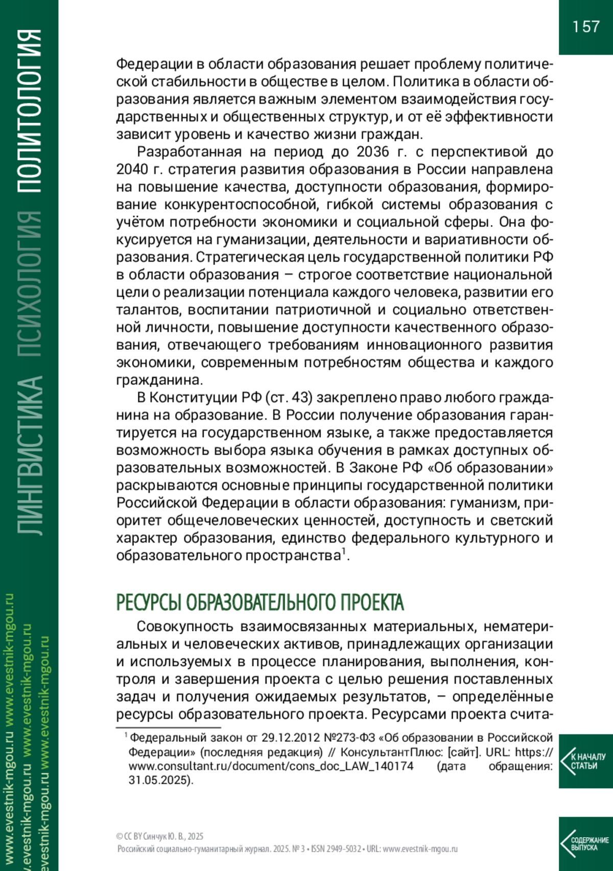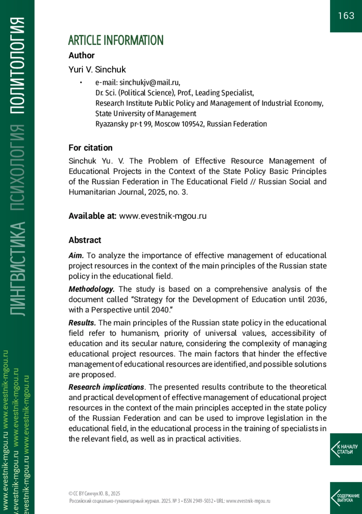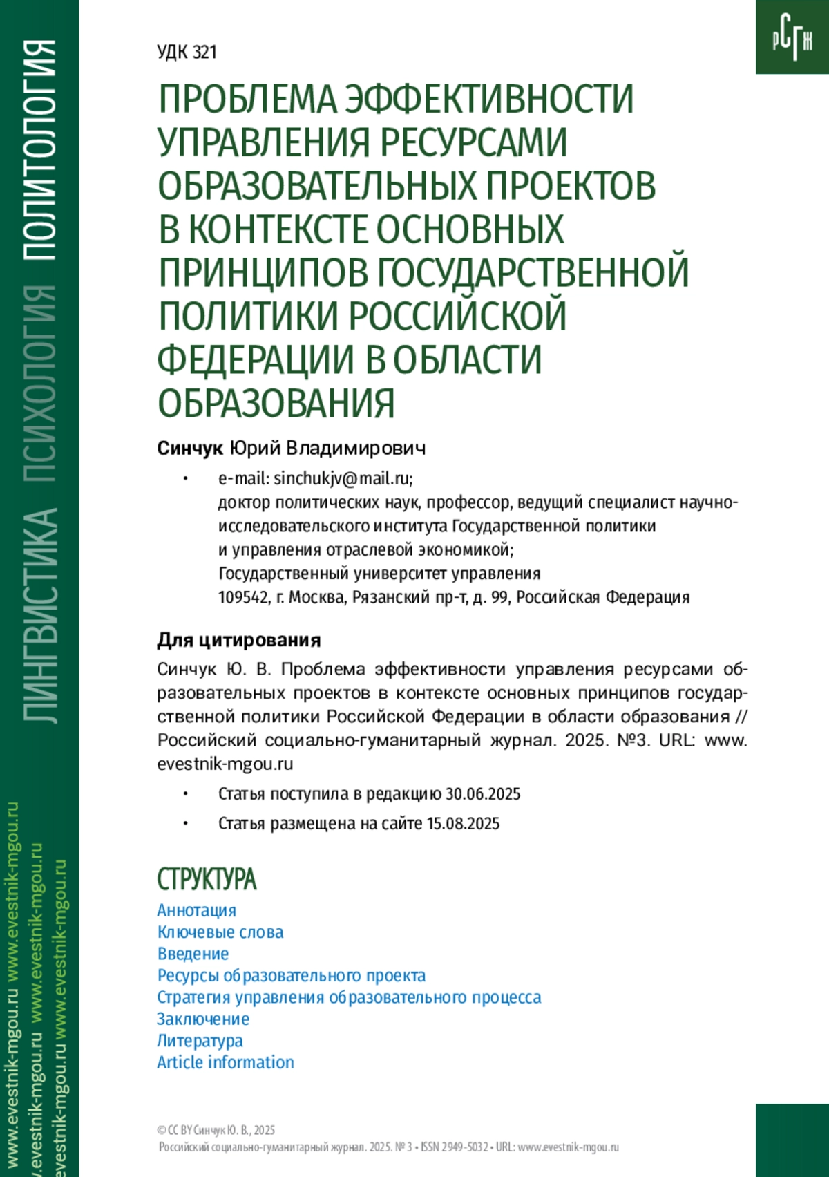 СИНЧУК Ю. В. ПРОБЛЕМА ЭФФЕКТИВНОСТИ УПРАВЛЕНИЯ РЕСУРСАМИ ОБРАЗОВАТЕЛЬНЫХ ПРОЕКТОВ В КОНТЕКСТЕ ОСНОВНЫХ ПРИНЦИПОВ ГОСУДАРСТВЕННОЙ ПОЛИТИКИ РОССИЙСКОЙ ФЕДЕРАЦИИ В ОБЛАСТИ ОБРАЗОВАНИЯ // РОССИЙСКИЙ СОЦИАЛЬНО-ГУМАНИТАРНЫЙ ЖУРНАЛ. 2025. №3