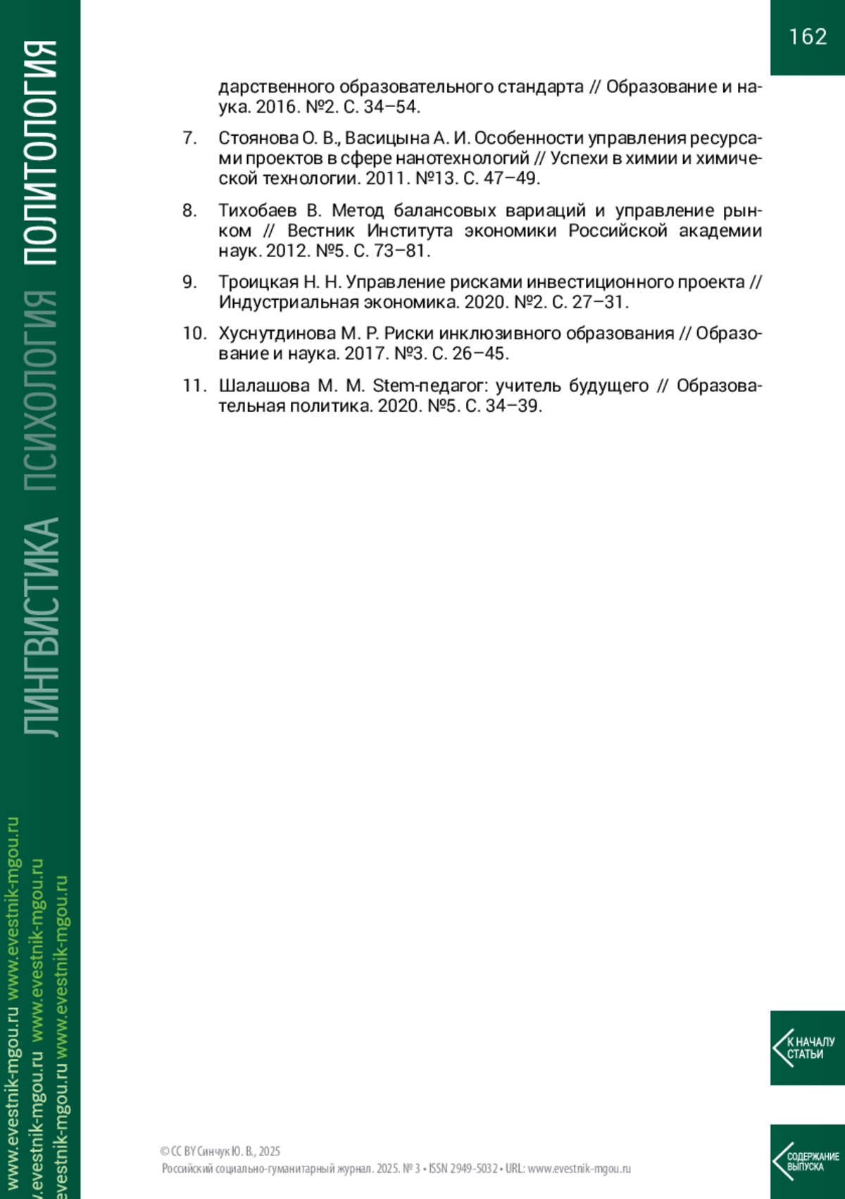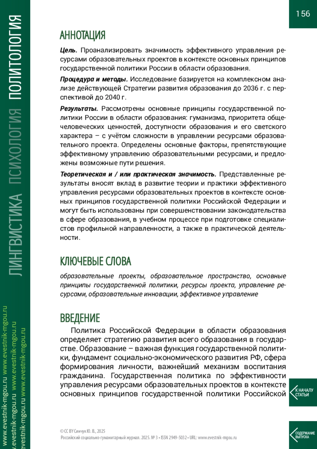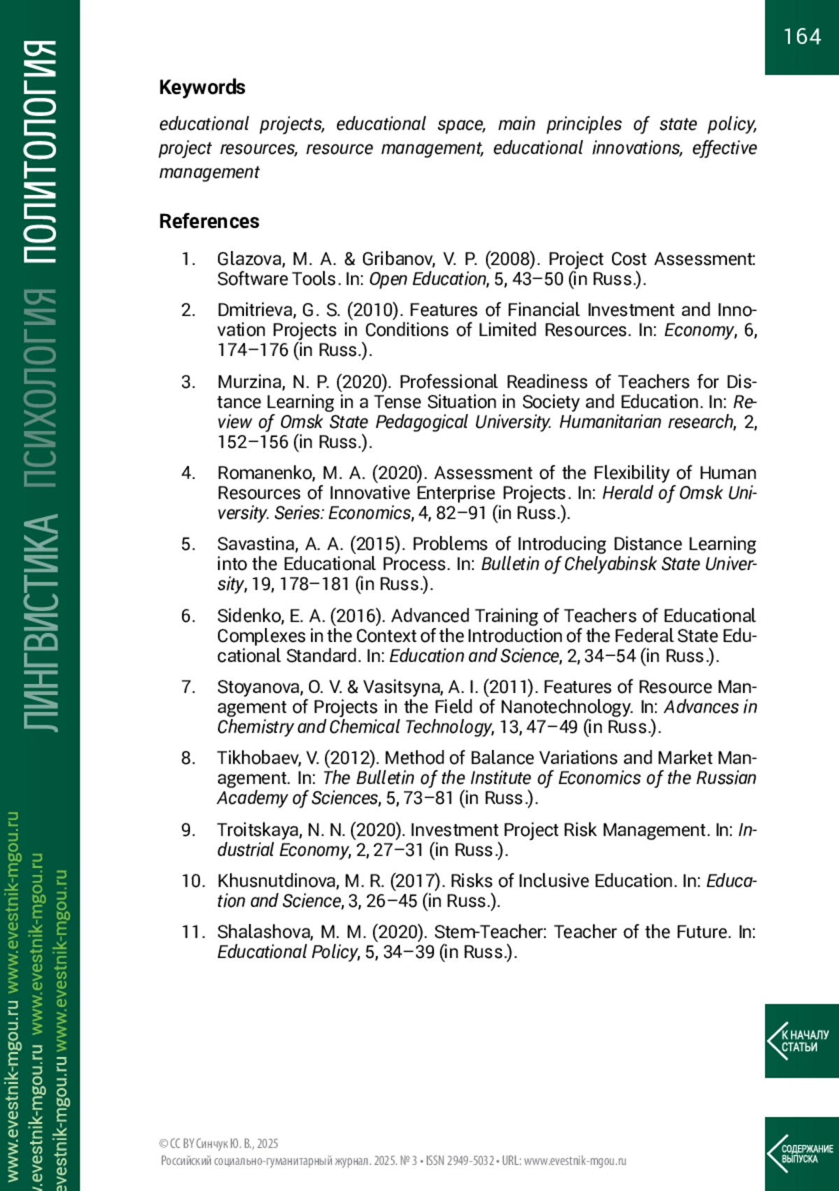 СИНЧУК Ю. В. ПРОБЛЕМА ЭФФЕКТИВНОСТИ УПРАВЛЕНИЯ РЕСУРСАМИ ОБРАЗОВАТЕЛЬНЫХ ПРОЕКТОВ В КОНТЕКСТЕ ОСНОВНЫХ ПРИНЦИПОВ ГОСУДАРСТВЕННОЙ ПОЛИТИКИ РОССИЙСКОЙ ФЕДЕРАЦИИ В ОБЛАСТИ ОБРАЗОВАНИЯ // РОССИЙСКИЙ СОЦИАЛЬНО-ГУМАНИТАРНЫЙ ЖУРНАЛ. 2025. №3