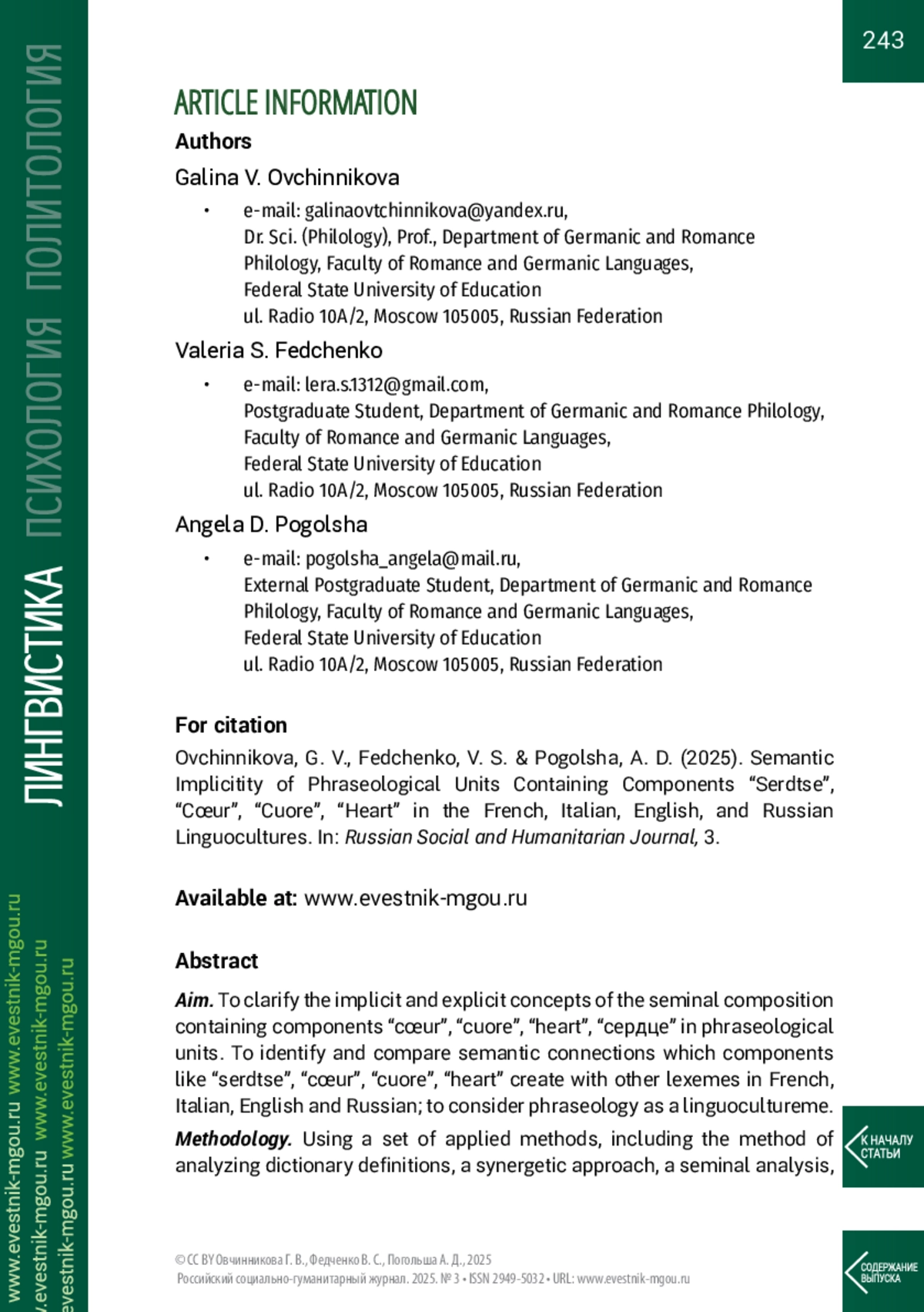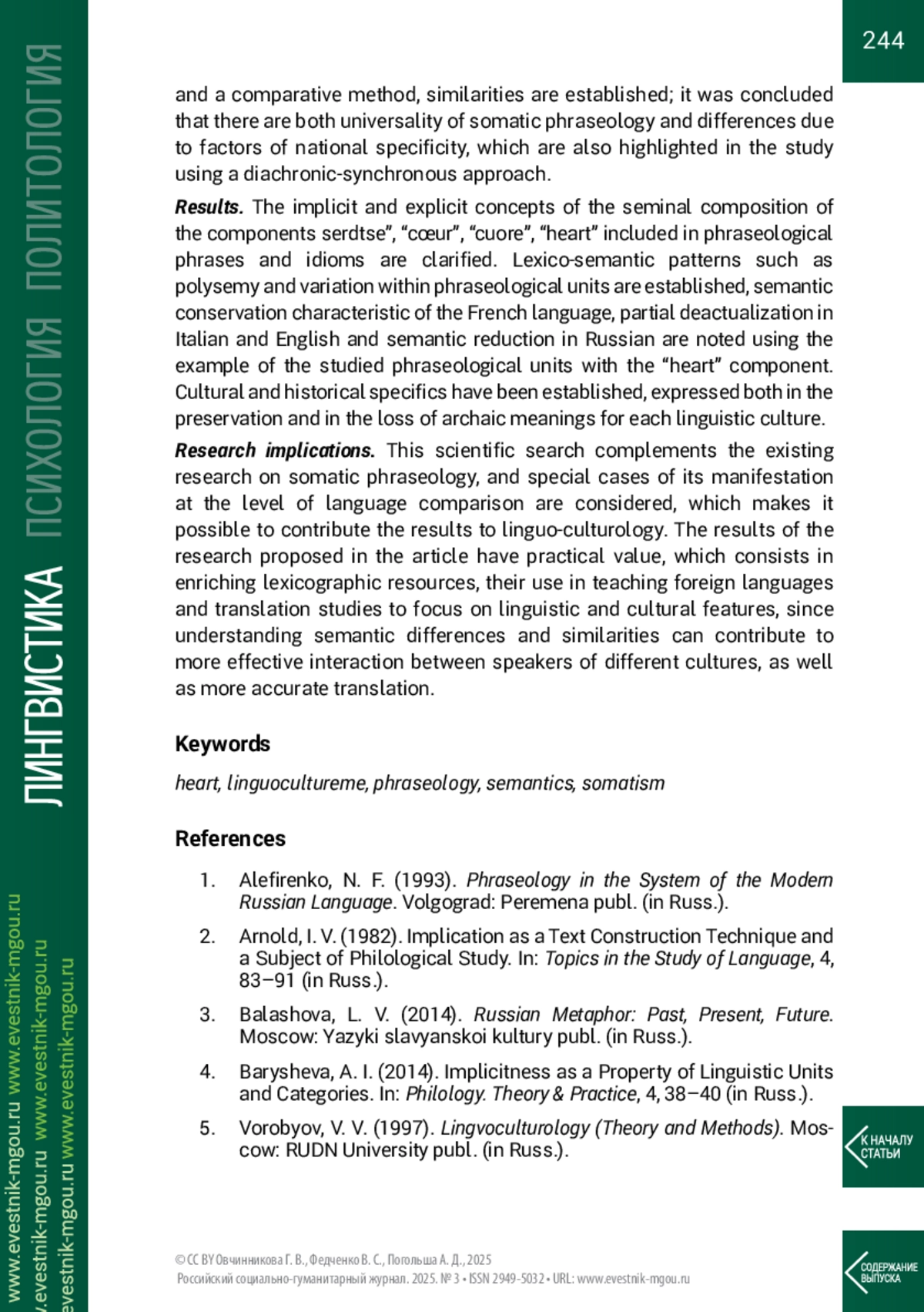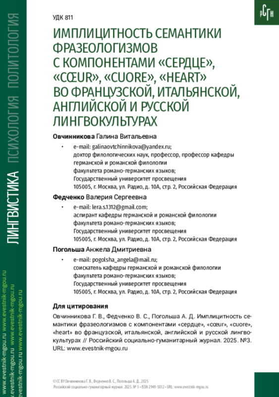 ОВЧИННИКОВА Г. В., ФЕДЧЕНКО В. С., ПОГОЛЬША А. Д. ИМПЛИЦИТНОСТЬ СЕМАНТИКИ ФРАЗЕОЛОГИЗМОВ С КОМПОНЕНТАМИ «СЕРДЦЕ», «CŒUR», «CUORE», «HEART» ВО ФРАНЦУЗСКОЙ, ИТАЛЬЯНСКОЙ, АНГЛИЙСКОЙ И РУССКОЙ ЛИНГВОКУЛЬТУРАХ // РОССИЙСКИЙ СОЦИАЛЬНО-ГУМАНИТАРНЫЙ ЖУРНАЛ. 2025. №3