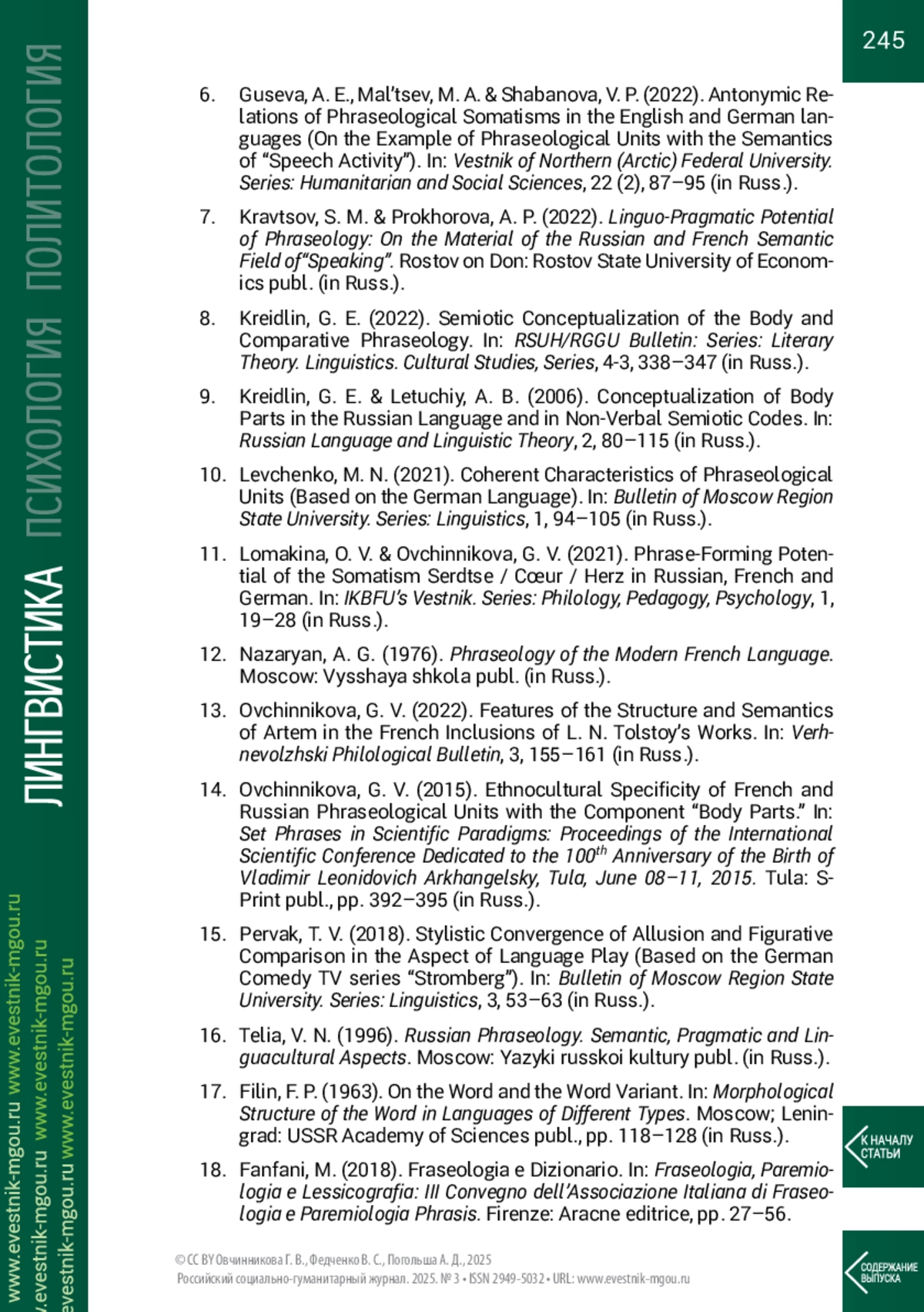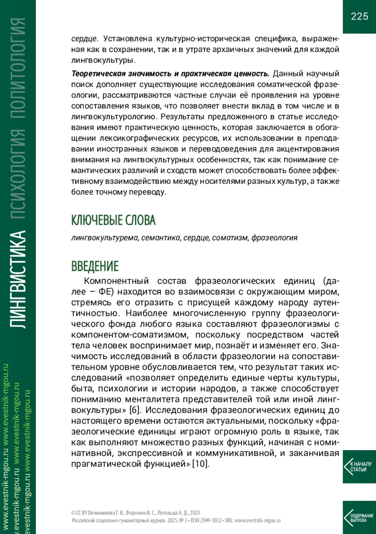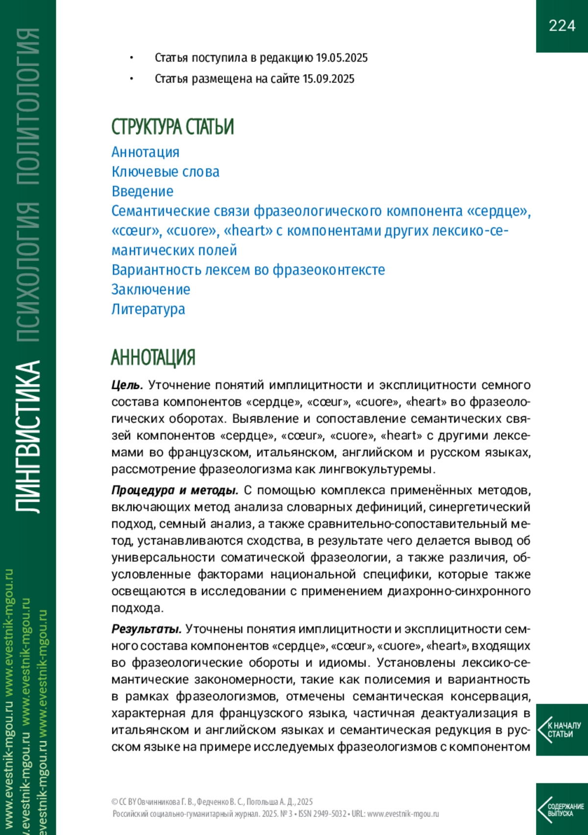 ОВЧИННИКОВА Г. В., ФЕДЧЕНКО В. С., ПОГОЛЬША А. Д. ИМПЛИЦИТНОСТЬ СЕМАНТИКИ ФРАЗЕОЛОГИЗМОВ С КОМПОНЕНТАМИ «СЕРДЦЕ», «CŒUR», «CUORE», «HEART» ВО ФРАНЦУЗСКОЙ, ИТАЛЬЯНСКОЙ, АНГЛИЙСКОЙ И РУССКОЙ ЛИНГВОКУЛЬТУРАХ // РОССИЙСКИЙ СОЦИАЛЬНО-ГУМАНИТАРНЫЙ ЖУРНАЛ. 2025. №3