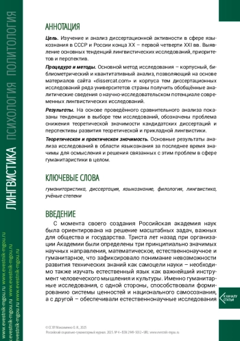 Статья: ЭВОЛЮЦИЯ ДИССЕРТАЦИОННОЙ АКТИВНОСТИ В РОССИИ В СФЕРЕ ЯЗЫКОЗНАНИЯ (2025)