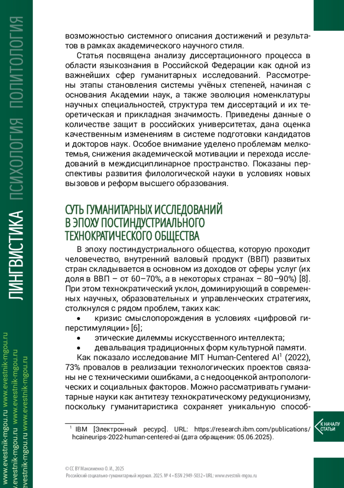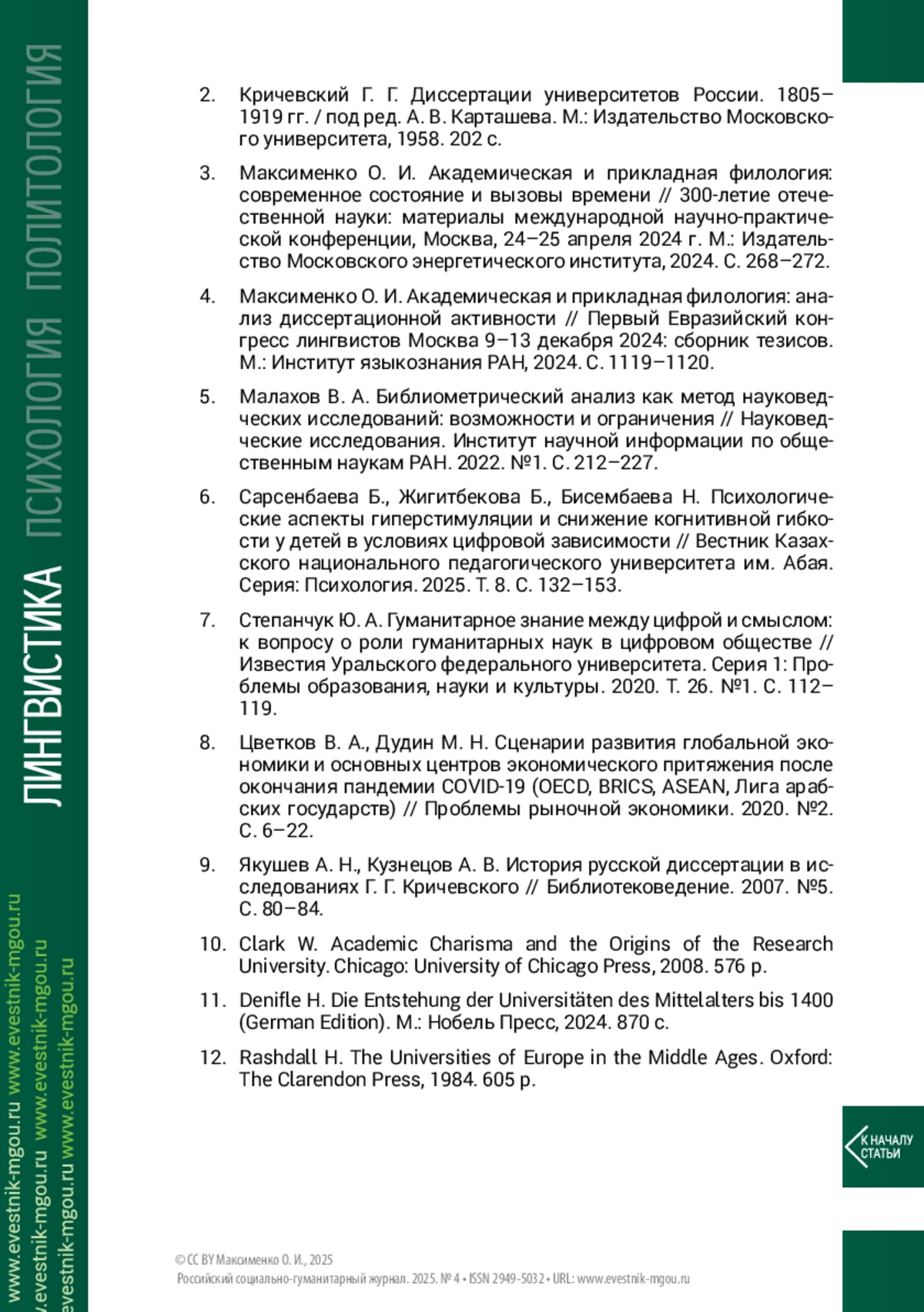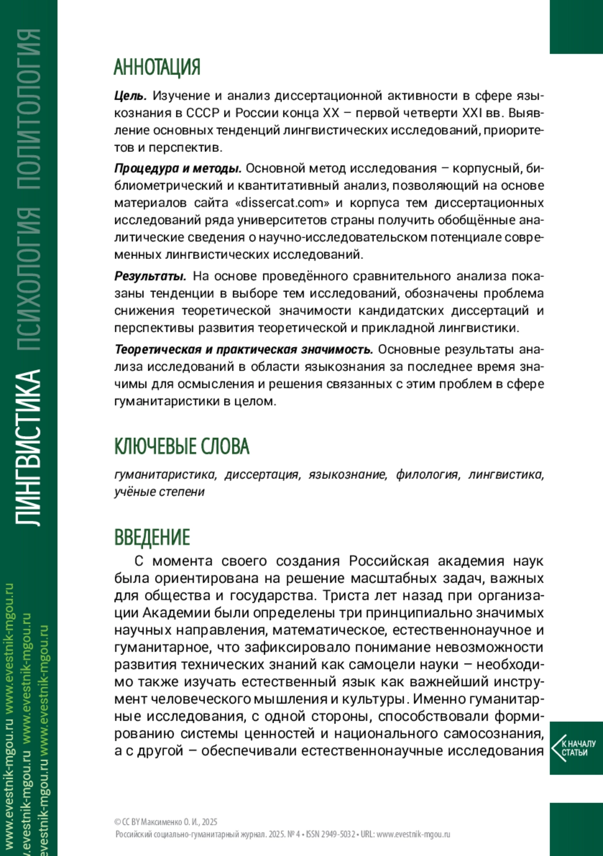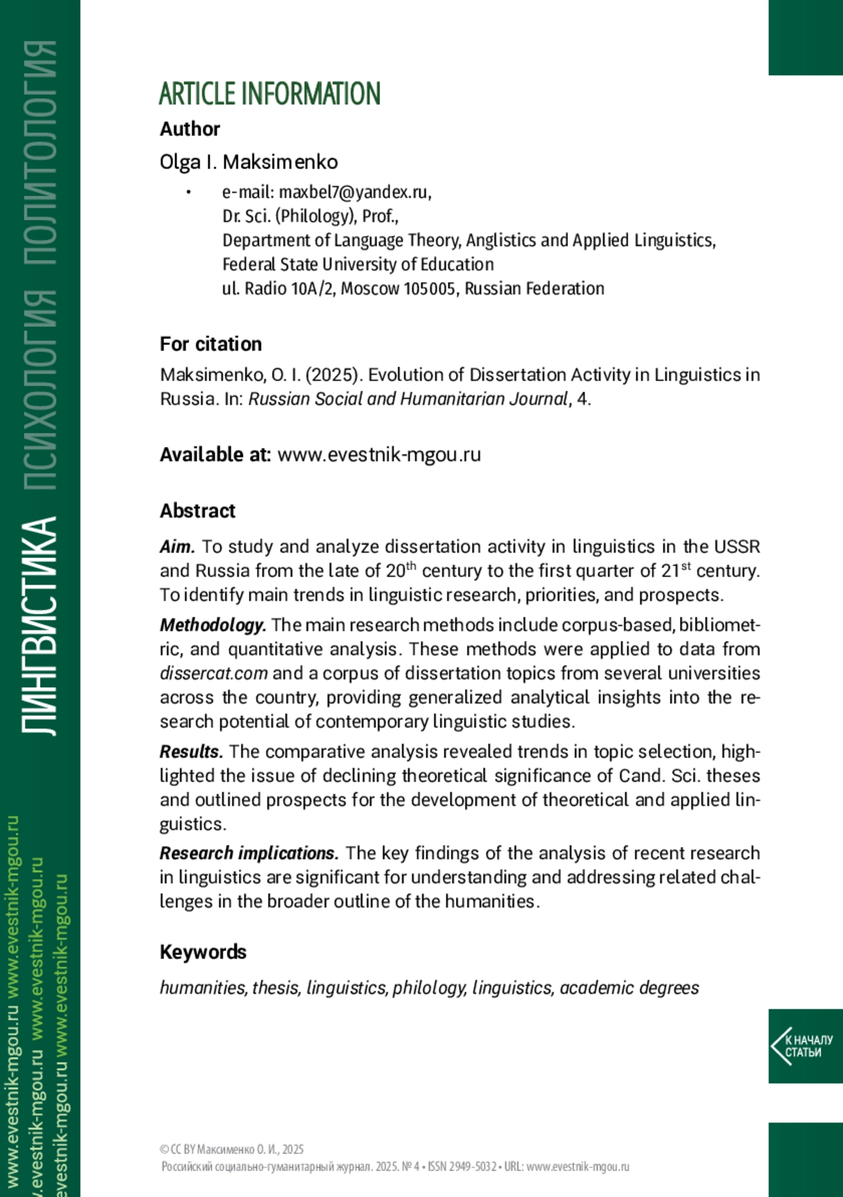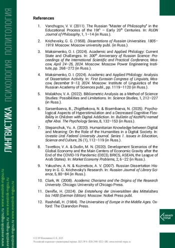 МАКСИМЕНКО О. И. ЭВОЛЮЦИЯ ДИССЕРТАЦИОННОЙ АКТИВНОСТИ В РОССИИ В СФЕРЕ ЯЗЫКОЗНАНИЯ // РОССИЙСКИЙ СОЦИАЛЬНО-ГУМАНИТАРНЫЙ ЖУРНАЛ. 2025. №4