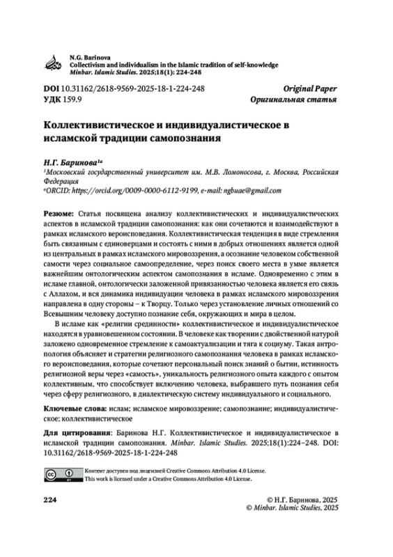 В исламе как «религии срединности» коллективистическое и индивидуалистическое находятся в уравновешенном состоянии. В человеке как творении с двойственной натурой заложено одновременное стремление к самоактуализации и тяга к социуму. Такая антропология объясняет и стратегии религиозного самопознания человека в рамках исламского вероисповедания, которые сочетают персональный поиск знаний о бытии, истинность религиозной веры через «самость», уникальность религиозного опыта каждого с опытом коллективным, что способствует включению человека, выбравшего путь познания себя через сферу религиозного, в диалектическую систему индивидуального и социального.
