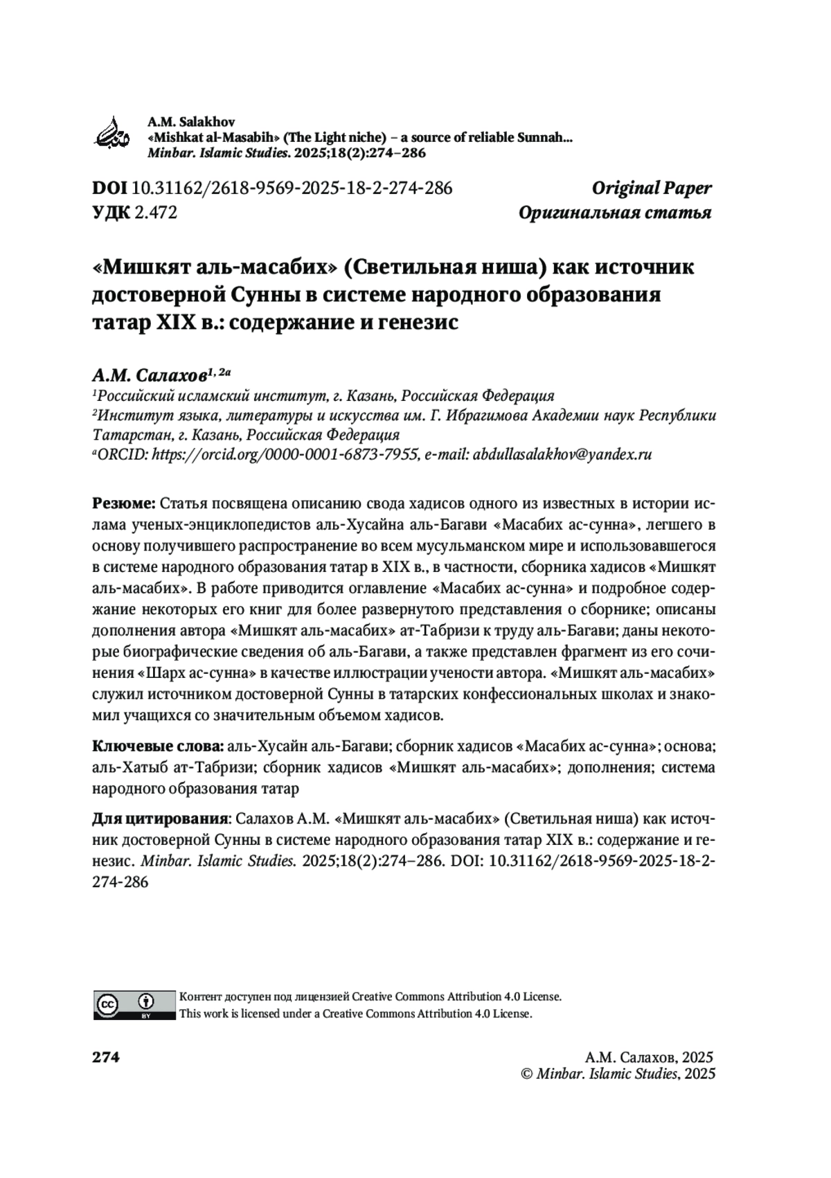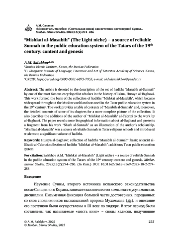 Статья посвящена описанию свода хадисов одного из известных в истории ислама ученых-энциклопедистов аль-Хусайна аль-Багави «Масабих ас-сунна», легшего в основу получившего распространение во всем мусульманском мире и использовавшегося в системе народного образования татар в XIX в., в частности сборника хадисов «Мишкят аль-масабих». В работе приводится оглавление «Масабих ас-сунна» и подробное содержание некоторых его книг для более развернутого представления о сборнике; описаны дополнения автора «Мишкят аль-масабих» ат-Табризи к труду аль-Багави; даны некоторые биографические сведения об аль-Багави, а также представлен фрагмент из его сочинения «Шарх ас-сунна» в качестве иллюстрации учености автора. «Мишкят аль-масабих» служил источником достоверной Сунны в татарских конфессиональных школах и знакомил учащихся со значительным объемом хадисов.
