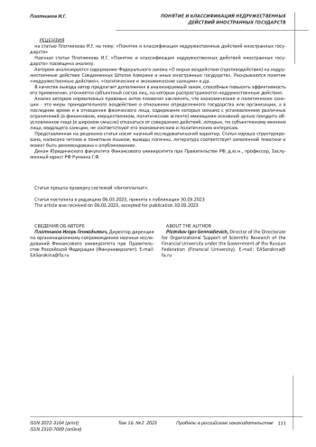 1. Бахин С.В., Еременко И.Ю. Односторонние экономические “санкции” и международное право // Закон“, 2017, № 11. С. 162-175. EDN: ZVRJVB